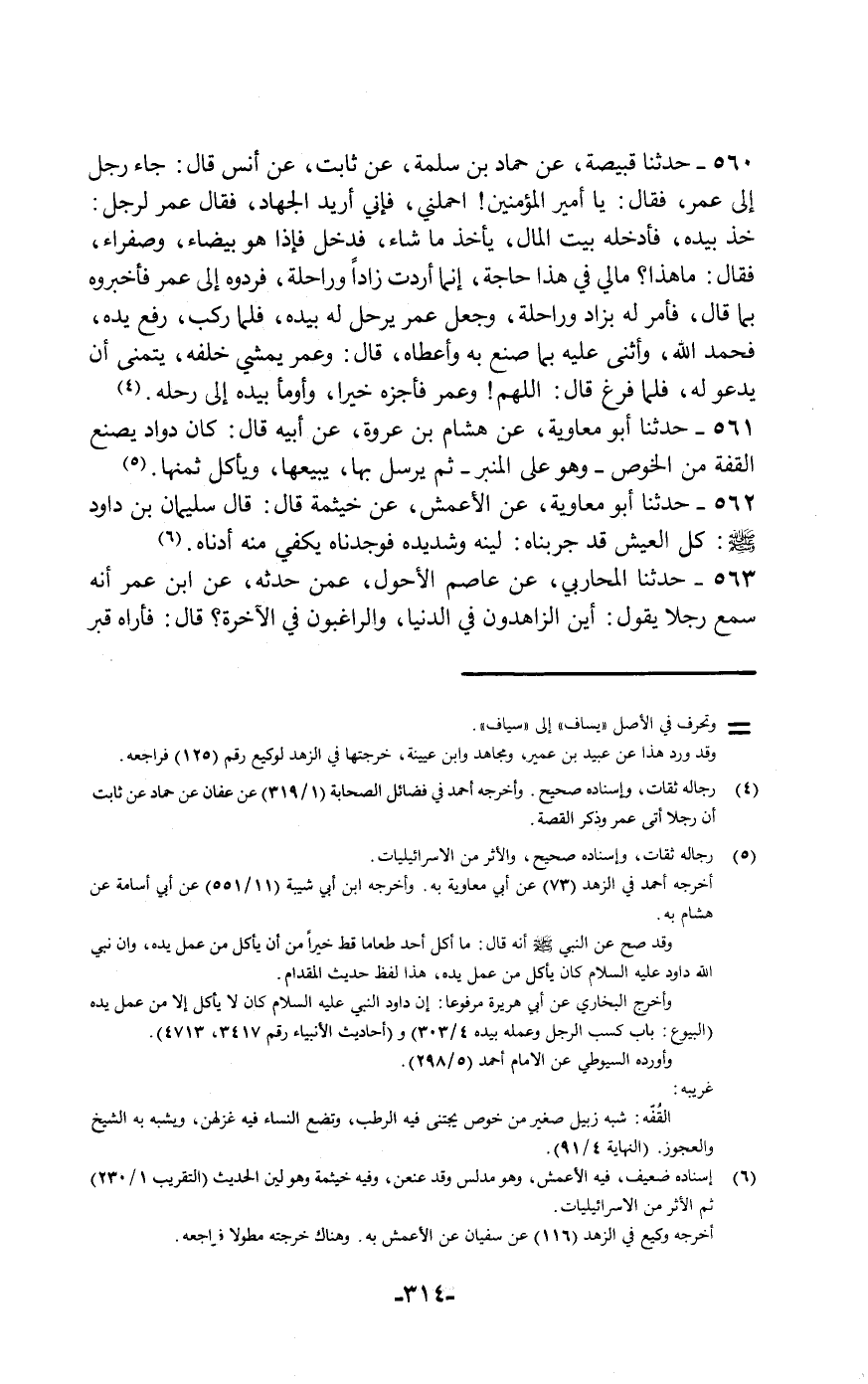 561 - حَدَّثَنَا أَبُو مُعَاوِيَةَ , عَنْ هِشَامِ بْنِ عُرْوَةَ , عَنْ أَبِيهِ قَالَ: «§كَانَ دَاوُدُ يَصْنَعُ الْقُفَّةَ مِنَ الْخُوصِ وَهُوَ عَلَى الْمِنْبَرِ ثُمَّ يُرْسِلُ بِهَا يَبِيعُهَا وَيَأْكُلُ ثَمَنَهَا»