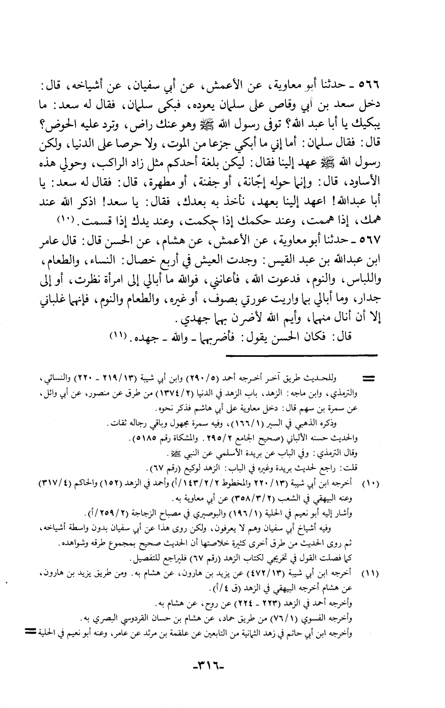 566 - حَدَّثَنَا أَبُو مُعَاوِيَةَ , عَنِ الْأَعْمَشِ , عَنْ أَبِي سُفْيَانَ , عَنْ أَشْيَاخِهِ قَالَ: دَخَلَ سَعْدُ بْنُ أَبِي وَقَّاصٍ عَلَى سَلْمَانَ يَعُودُهُ فَبَكَى سَلْمَانُ , فَقَالَ لَهُ سَعْدٌ: مَا يُبْكِيكَ يَا أَبَا عَبْدِ اللَّهِ؟ تُوُفِّيَ رَسُولُ اللَّهِ صَلَّى اللهُ عَلَيْهِ وَسَلَّمَ وَهُوَ عَنْكَ رَاضٍ، وَتَرِدُ عَلَيْهِ الْحَوْضَ. قَالَ: فَقَالَ سَلْمَانُ: أَمَا إِنِّي مَا أَبْكِي جَزَعًا مِنَ الْمَوْتِ وَلَا حِرْصًا عَلَى الدُّنْيَا وَلَكِنَّ رَسُولَ اللَّهِ صَلَّى اللهُ عَلَيْهِ وَسَلَّمَ عَهِدَ إِلَيْنَا , فَقَالَ: «§لِيَكُنْ بُلْغَةُ أَحَدِكُمْ مِثْلَ زَادِ الرَّاكِبِ» , وَحَوْلِي هَذِهِ الْأَسَاوِدُ قَالَ: وَإِنَّمَا حَوْلَهُ إِجَّانَةٌ أَوْ جَفْنَةٌ أَوْ مَطْهَرَةٌ قَالَ: فَقَالَ لَهُ سَعْدٌ: يَا أَبَا عَبْدِ اللَّهِ اعْهَدْ إِلَيْنَا بِعَهْدٍ نَأْخُذُ بِهِ بَعْدَكَ , فَقَالَ: يَا سَعْدُ اذْكُرِ اللَّهَ عِنْدَ هَمِّكَ إِذَا هَمَمْتَ , وَعِنْدَ حُكْمِكَ إِذَا حَكَمْتَ , وَعِنْدَ يَدِكَ إِذَا قَسَمْتَ