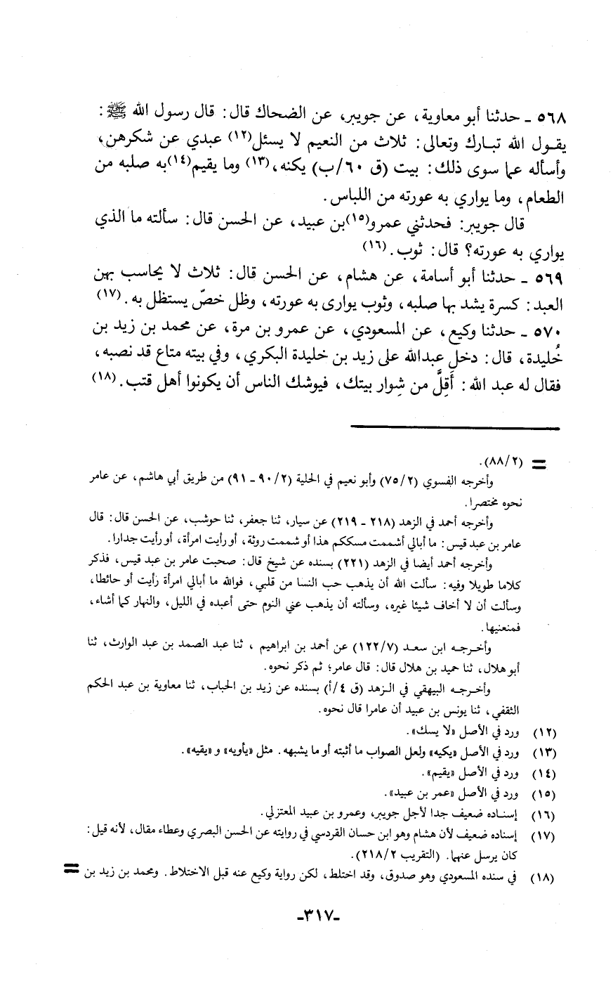 568 - حَدَّثَنَا أَبُو مُعَاوِيَةَ , عَنْ جُوَيْبِرٍ , عَنِ الضَّحَّاكِ قَالَ: قَالَ رَسُولُ اللَّهِ صَلَّى اللهُ عَلَيْهِ وَسَلَّمَ: " يَقُولُ اللَّهُ تَبَارَكَ وَتَعَالَى: §ثَلَاثٌ مِنَ النَّعِيمِ لَا يُسْأَلُ عَبْدِي عَنْ شُكْرِهِنَّ وَأَسْأَلُهُ عَمَّا سِوَى ذَلِكَ: بَيْتٌ يَكُنُّهُ , وَمَا يُقِيمُ بِهِ صُلْبَهُ مِنَ الطَّعَامِ , وَمَا يُوَارِي بِهِ عَوْرَتَهُ مِنَ اللِّبَاسِ ". قَالَ جُوَيْبِرٌ: فَحَدَّثَنِي عَمْرُو بْنُ عُبَيْدٍ , عَنِ الْحَسَنِ قَالَ: سَأَلْتُهُ مَا الَّذِي يُوَارِي بِهِ عَوْرَتَهُ؟ قَالَ: ثَوْبٌ