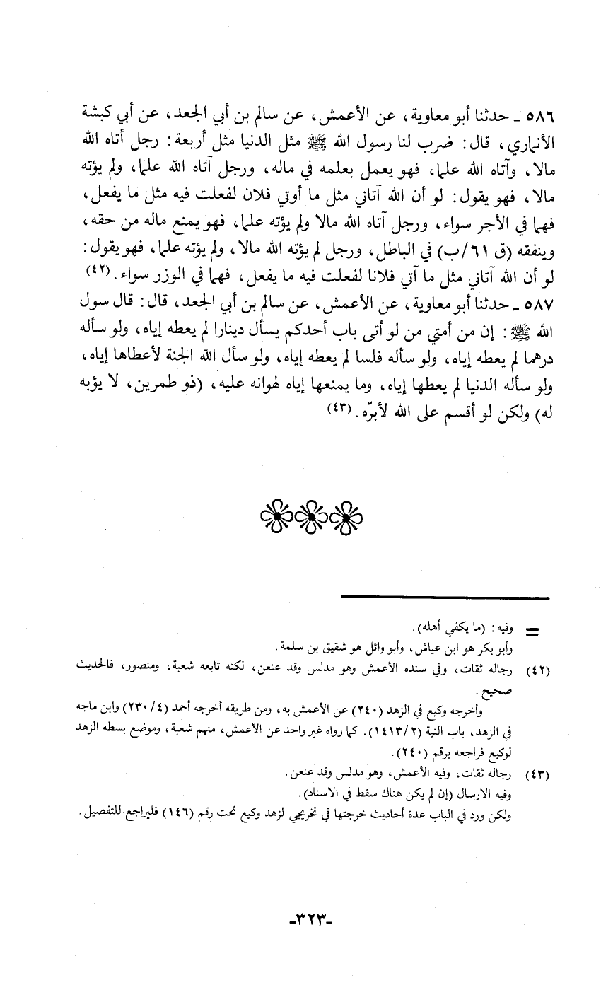 586 - حَدَّثَنَا أَبُو مُعَاوِيَةَ , عَنِ الْأَعْمَشِ , عَنْ سَالِمِ بْنِ أَبِي الْجَعْدِ , عَنْ أَبِي كَبْشَةَ الْأَنْمَارِيِّ قَالَ: ضَرَبَ لَنَا رَسُولُ اللَّهِ صَلَّى اللهُ عَلَيْهِ وَسَلَّمَ §مَثَلَ الدُّنْيَا مَثَلَ أَرْبَعَةٍ: رَجُلٌ أَتَاهُ اللَّهُ مَالًا وَأَتَاهُ اللَّهُ عِلْمًا فَهُوَ يَعْمَلُ بِعِلْمِهِ فِي مَالِهِ , وَرَجُلٌ آتَاهُ اللَّهُ عِلْمًا وَلَمْ يُؤْتِهِ مَالًا فَهُوَ يَقُولُ: لَوْ أَنَّ اللَّهَ آتَانِي مِثْلَ مَا أُوتِيَ فُلَانٌ لَفَعَلْتُ فِيهِ مِثْلَ مَا يَفْعَلُ فَهُمَا فِي الْأَجْرِ سَوَاءٌ , وَرَجُلٌ آتَاهُ اللَّهُ مَالًا وَلَمْ يُؤْتِهِ عِلْمًا فَهُوَ يَمْنَعُ مَالَهُ مِنْ حَقِّهِ وَيُنْفِقُهُ فِي الْبَاطِلِ , وَرَجُلٌ لَمْ يُؤْتِهِ اللَّهُ مَالًا وَلَمْ يُؤْتِهِ عِلْمًا فَهُوَ يَقُولُ لَوْ أَنَّ اللَّهَ آتَانِي مِثْلَ مَا آتَى فُلَانًا لَفَعَلْتُ فِيهِ مَا يَفْعَلُ فَهُمَا فِي الْوِزْرِ سَوَاءٌ "