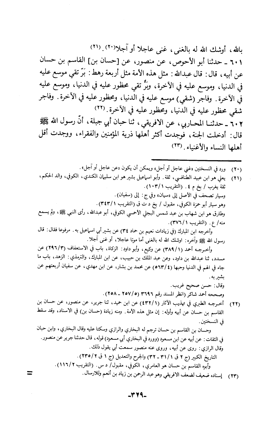 602 - حَدَّثَنَا الْمُحَارِبِيُّ , عَنِ الْإِفْرِيقِيِّ , ثنا حَبَّانُ بْنُ أَبِي جَبَلَةَ أَنَّ رَسُولَ اللَّهِ صَلَّى اللهُ عَلَيْهِ وَسَلَّمَ قَالَ: «§أُدْخِلْتُ الْجَنَّةَ فَوَجَدْتُ أَكْثَرَ أَهْلِهَا ذُرِّيَّةَ الْمُؤْمِنِينَ وَالْفُقَرَاءِ , وَوَجَدْتُ أَقَلَّ أَهْلِهَا النِّسَاءَ وَالْأَغْنِيَاءَ»