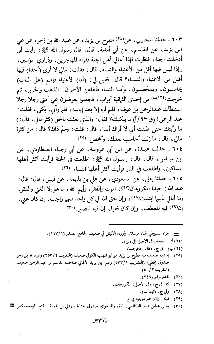 603 - حَدَّثَنَا الْمُحَارِبِيُّ , عَنْ مُطَّرِحِ بْنِ يَزِيدَ , عَنْ عُبَيْدِ اللَّهِ بْنِ زَحْرٍ , عَنْ عَلِيِّ بْنِ يَزِيدَ , عَنِ الْقَاسِمِ , عَنْ أَبِي أُمَامَةَ قَالَ: قَالَ رَسُولُ اللَّهِ صَلَّى اللهُ عَلَيْهِ وَسَلَّمَ: " §رَأَيْتُ أَنِّي أُدْخِلْتُ الْجَنَّةَ فَنَظَرْتُ فَإِذَا أَعَالِي أَهْلِ الْجَنَّةِ فُقَرَاءُ الْمُهَاجِرِينَ وَذَرَارِيُّ الْمُؤْمِنِينَ , وَإِذَا لَيْسَ فِيهَا أَقَلُّ مِنَ الْأَغْنِيَاءِ وَالنِّسَاءِ قَالَ: فَقُلْتُ: مَالِي لَا أَرَى أَحَدًا فِيهَا أَقَلَّ مِنَ الْأَغْنِيَاءِ وَالنِّسَاءِ؟ قَالَ: فَقِيلَ لِي: أَمَّا الْأَغْنِيَاءُ فَإِنَّهُمْ عَلَى الْبَابِ يُحَاسَبُونَ وَيُمَحَّصُونَ , وَأَمَّا النِّسَاءُ فَأَلْهَاهُنَّ الْأَحْمَرَانِ الذَّهَبُ وَالْحَرِيرُ , ثُمَّ خَرَجْتُ مِنْ إِحْدَى الثَّمَانِيَةِ أَبْوَابٍ فَجَعَلُوا يَعْرِضُونَ عَلَيَّ أُمَّتِي رَجُلًا رَجُلًا اسْتَبْطَأْتُ عَبْدَ الرَّحْمَنِ بْنَ عَوْفٍ فَلَمْ أَرَهُ إِلَّا بَعْدَ إِيَاسِهِ , فَلَمَّا رَآنِي بَكَى , فَقُلْتُ: عَبْدَ الرَّحْمَنِ , مَا يُبْكِيكَ , فَقَالَ وَالَّذِي بَعَثَكَ بِالْحَقِّ كَثُرَ مَالِي. قَالَ: مَا رَأَيْتُكَ حَتَّى ظَنَنْتُ أَنِّي لَا أَرَاكَ أَبَدًا. قَالَ: قُلْتُ: وَمِمَّ ذَاكَ؟ قَالَ: مِنْ كَثْرَةِ مَالِي قَالَ: مَا زِلْتُ أُحَاسَبُ بَعْدَكَ وَأُمَحَّصُ "