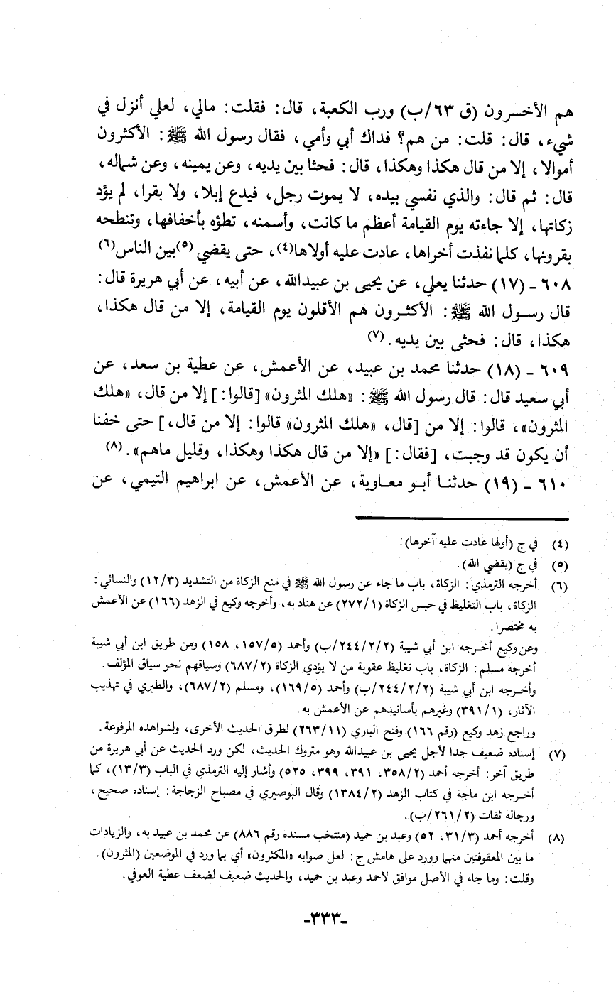 حَدَّثَنَا مُحَمَّدُ بْنُ عُبَيْدٍ , عَنِ الْأَعْمَشِ , عَنْ عَطِيَّةَ بْنِ سَعْدٍ , عَنْ أَبِي سَعِيدٍ قَالَ: قَالَ رَسُولُ اللَّهِ صَلَّى اللهُ عَلَيْهِ وَسَلَّمَ: «§هَلَكَ الْمُثْرُونَ» . قَالُوا: إِلَّا مَنْ قَالَ: «هَلَكَ الْمُثْرُونَ» قَالُوا: إِلَّا مَنْ؟ قَالَ: «هَلَكَ الْمُثْرُونَ» قَالُوا: إِلَّا مَنْ؟ قَالَ: حَتَّى خِفْنَا أَنْ يَكُونَ قَدْ وَجَبَتْ , فَقَالَ: «إِلَّا مَنْ قَالَ هَكَذَا وَهَكَذَا , وَقَلِيلٌ مَا هُمْ»