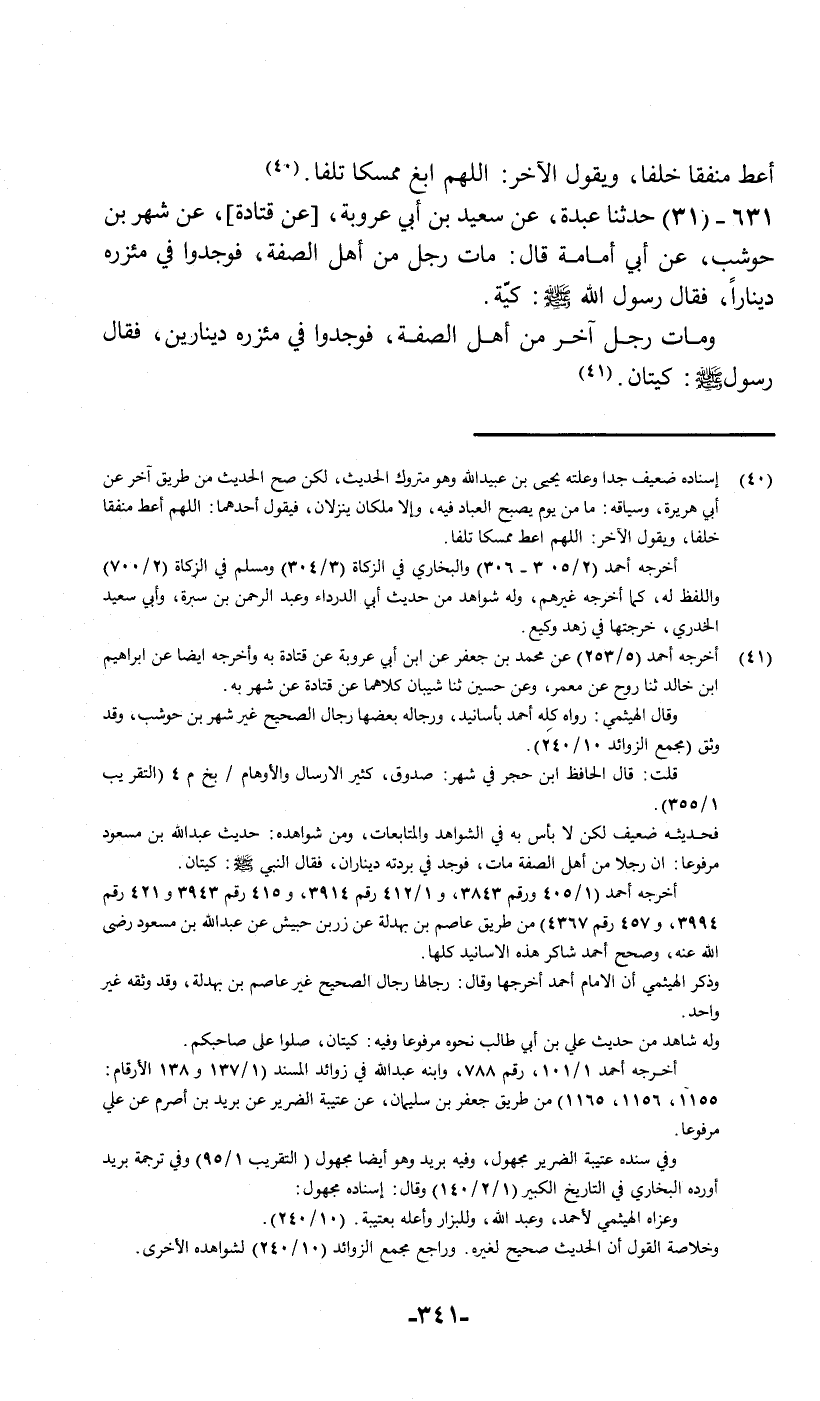 631313131 - حَدَّثَنَا عَبْدَةُ , عَنْ سَعِيدِ بْنِ أَبِي عَرُوبَةَ , عَنْ قَتَادَةَ , عَنْ شَهْرِ بْنِ حَوْشَبٍ , عَنْ أَبِي أُمَامَةَ قَالَ: مَاتَ رَجُلٌ مِنْ أَهْلِ الصُّفَّةِ فَوَجَدُوا فِي مِئْزَرِهِ دِينَارًا , فَقَالَ رَسُولُ اللَّهِ صَلَّى اللهُ عَلَيْهِ وَسَلَّمَ: «§كَيَّةٌ» , وَمَاتَ رَجُلٌ آخَرُ مِنْ أَهْلِ الصُّفَّةِ فَوَجَدُوا فِي مِئْزَرِهِ دِينَارَيْنِ , فَقَالَ رَسُولُ اللَّهِ صَلَّى اللهُ عَلَيْهِ وَسَلَّمَ: «كَيَّتَانِ»