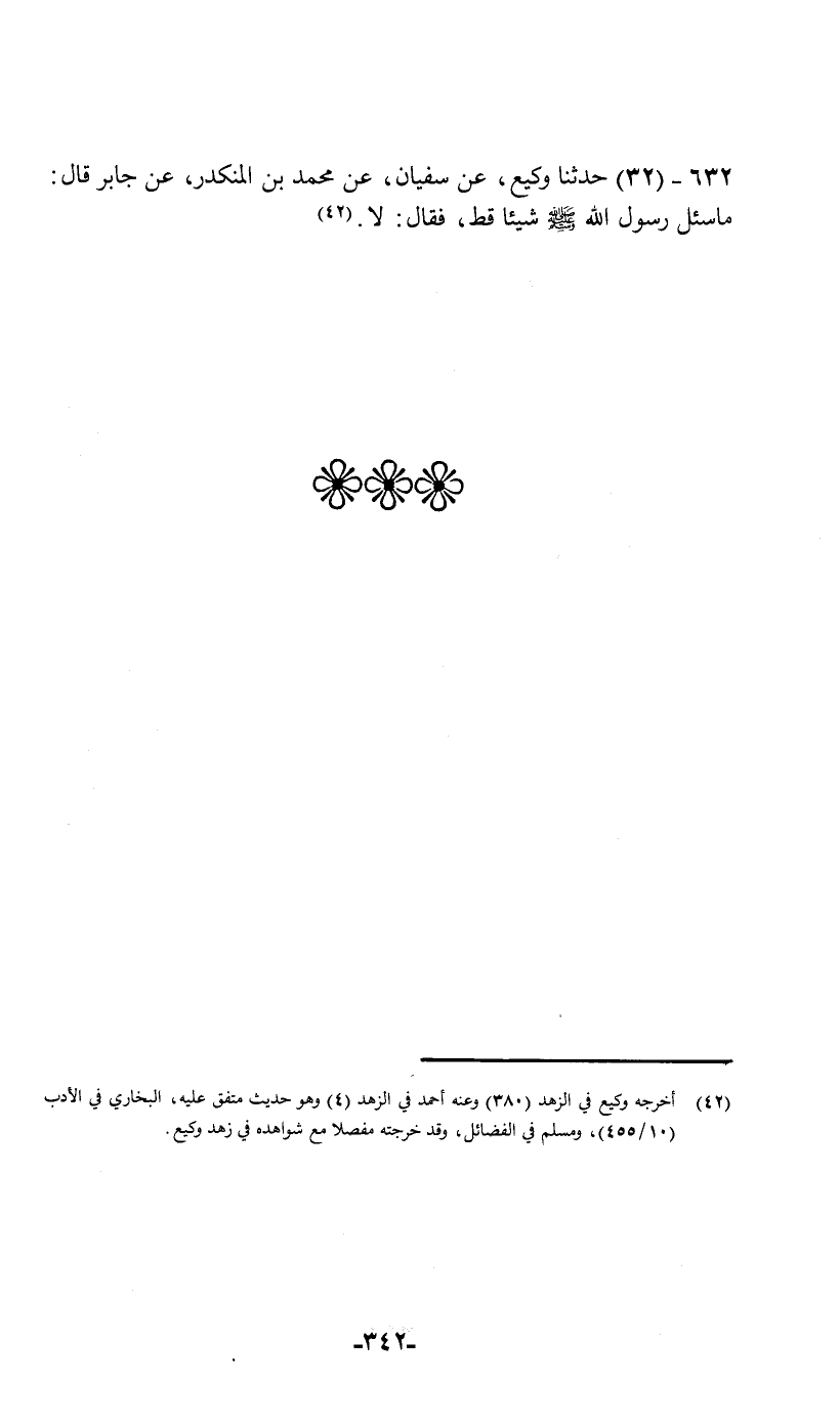 حَدَّثَنَا وَكِيعٌ , عَنْ سُفْيَانَ , عَنْ مُحَمَّدِ بْنِ الْمُنْكَدِرِ , عَنْ جَابِرٍ قَالَ: " §مَا سُئِلَ رَسُولُ اللَّهِ صَلَّى اللهُ عَلَيْهِ وَسَلَّمَ شَيْئًا قَطُّ , فَقَالَ: «لَا»