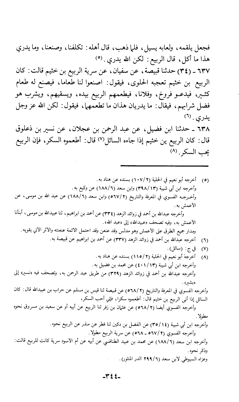 حَدَّثَنَا ابْنُ فُضَيْلٍ , عَنْ عَبْدِ الرَّحْمَنِ بْنِ عَجْلَانَ , عَنْ نُسَيْرِ بْنِ ذُعْلُوقٍ قَالَ: كَانَ الرَّبِيعُ بْنُ خُثَيْمٍ إِذَا جَاءَهُ السَّائِلُ قَالَ: «§أَطْعِمُوهُ السُّكَّرَ فَإِنَّ الرَّبِيعَ يُحِبُّ السُّكَّرَ»