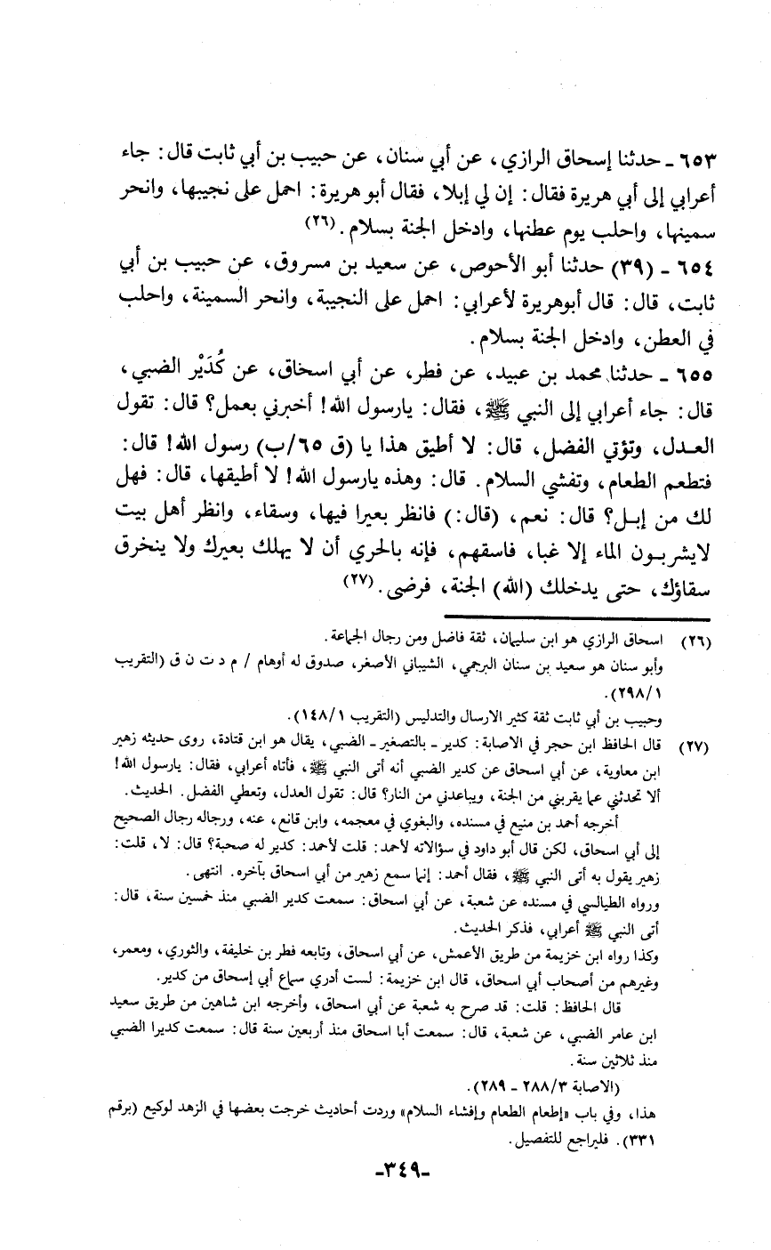 حَدَّثَنَا إِسْحَاقُ الرَّازِيُّ , عَنْ أَبِي سِنَانٍ , عَنْ حَبِيبِ بْنِ أَبِي ثَابِتٍ قَالَ: جَاءَ أَعْرَابِيٌّ إِلَى أَبِي هُرَيْرَةَ , فَقَالَ: إِنَّ لِي إِبِلًا , فَقَالَ أَبُو هُرَيْرَةَ: «§احْمِلْ عَلَى نَجِيبِهَا , وَانْحَرْ سَمِينَهَا , وَاحْلِبْ يَوْمَ عَطَنِهَا وَادْخُلِ الْجَنَّةَ بِسَلَامٍ»