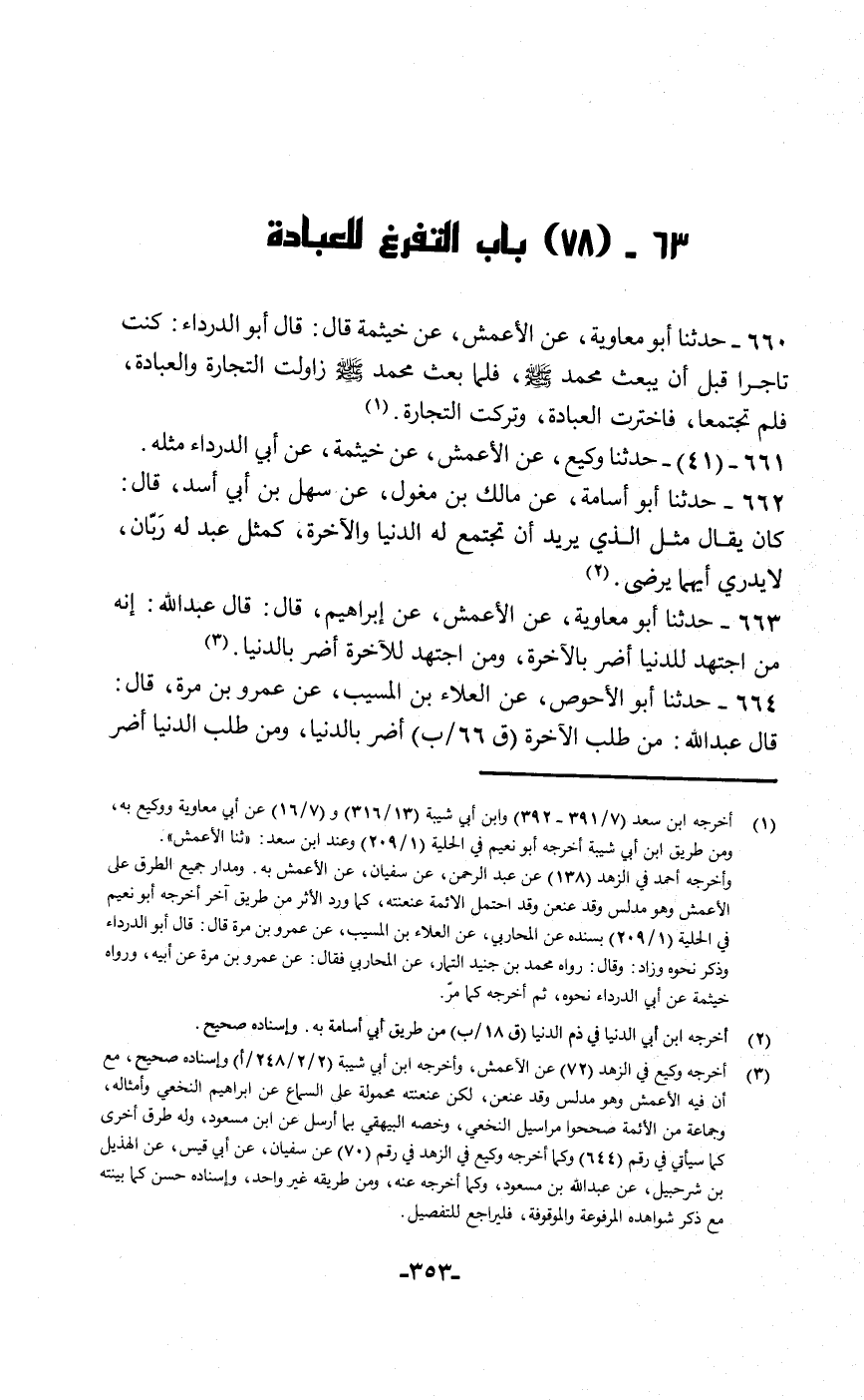 حَدَّثَنَا أَبُو مُعَاوِيَةَ، عَنِ الْأَعْمَشِ، عَنْ خَيْثَمَةَ قَالَ: قَالَ أَبُو الدَّرْدَاءِ: «كُنْتُ تَاجِرًا قَبْلَ أَنْ يُبْعَثَ مُحَمَّدٌ صَلَّى اللهُ عَلَيْهِ وَسَلَّمَ , فَلَمَّا بُعِثَ مُحَمَّدٌ صَلَّى اللهُ عَلَيْهِ وَسَلَّمَ زَاوَلْتُ التِّجَارَةَ وَالْعِبَادَةَ فَلَمْ تَجْتَمِعَا , §فَاخْتَرْتُ الْعِبَادَةَ وَتَرَكْتُ التِّجَارَةَ» حَدَّثَنَا وَكِيعٌ، عَنِ الْأَعْمَشِ، عَنْ خَيْثَمَةَ، عَنْ أَبِي الدَّرْدَاءِ مِثْلَهُ