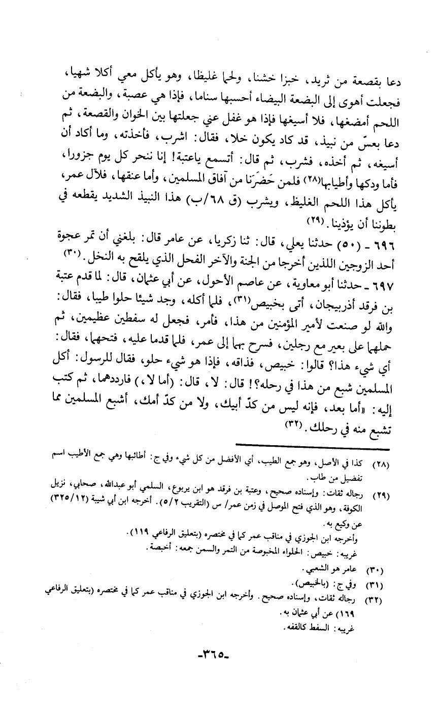 حَدَّثَنَا أَبُو مُعَاوِيَةَ، عَنْ عَاصِمٍ الْأَحْوَلِ، عَنْ أَبِي عُثْمَانَ قَالَ: لَمَّا قَدِمَ عُتْبَةُ بْنُ فَرْقَدٍ أَذْرَبَيْجَانَ أُتِيَ بِخَبِيصٍ , فَلَمَّا أَكَلَهُ وَجَدَ شَيْئًا حُلْوًا طَيِّبًا , فَقَالَ: " وَاللَّهِ , لَوْ صَنَعْتُ لِأَمِيرِ الْمُؤْمِنِينَ مِنْ هَذَا، فَأَمَرَ فَجَعَلَ لَهُ سَفَطَيْنِ عَظِيمَيْنِ , ثُمَّ حَمَلَهُمَا عَلَى بَعِيرٍ مَعَ رَجُلَيْنِ فَسَرَّحَ بِهِمَا إِلَى عُمَرَ , فَلَمَّا قَدِمَا عَلَيْهِ فَتَحَهُمَا , فَقَالَ: «أَيُّ شَيْءٍ هَذَا؟» قَالُوا: خَبِيصٌ فَذَاقَهُ فَإِذَا هُوَ شَيْءٌ حُلْوٌ , فَقَالَ لِلرَّسُولِ: «أَكُلُّ الْمُسْلِمِينَ شَبِعَ مِنْ هَذَا فِي رَحْلِهِ» قَالَ: لَا. قَالَ: «أَمَا لَا , فَارْدُدْهُمَا» ، ثُمَّ كَتَبَ إِلَيْهِ " أَمَّا بَعْدُ , فَإِنَّهُ لَيْسَ مِنْ كَدِّ أَبِيكَ , وَلَا مِنْ كَدِّ أُمِّكَ؛ §أَشْبِعِ الْمُسْلِمِينَ مِمَّا تَشْبَعُ مِنْهُ فِي رَحْلِكَ