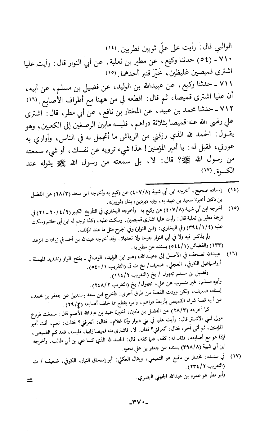 حَدَّثَنَا وَكِيعٌ، عَنْ مَطِيرِ بْنِ ثَعْلَبَةَ، عَنْ أَبِي النَّوَّارِ قَالَ: «رَأَيْتُ عَلِيًّا §اشْتَرَى قَمِيصَيْنِ غَلَيْظَيْنِ خَيَّرَ قَنْبَرَ أَحَدَهُمَا»