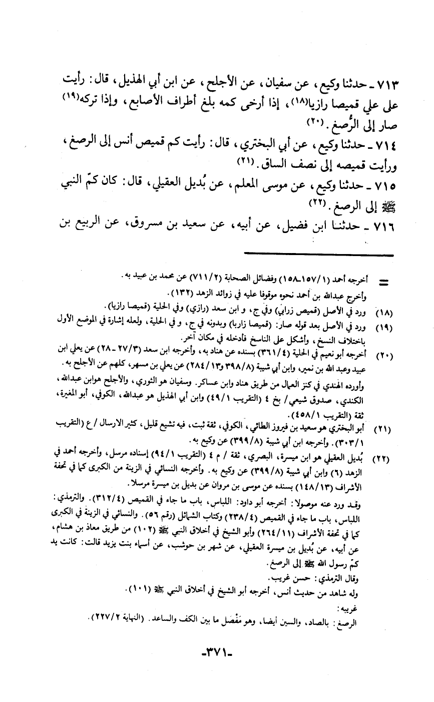 حَدَّثَنَا وَكِيعٌ، عَنْ سُفْيَانَ، عَنِ الْأَجْلَحِ، عَنِ ابْنِ أَبِي الْهُذَيْلِ قَالَ: «رَأَيْتُ §عَلَى عَلِيٍّ قَمِيصًا رَازِيًّا إِذَا أَرْخَى كُمَّهُ بَلَغَ أَطْرَافَ الْأَصَابِعِ , وَإِذَا تَرَكَهُ صَارَ إِلَى الرُّصْغِ»