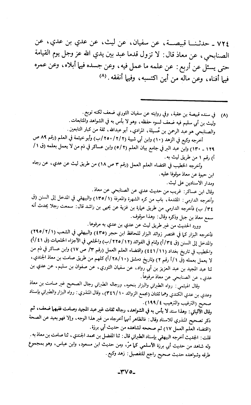 حَدَّثَنَا قَبِيصَةُ، عَنْ سُفْيَانَ، عَنْ لَيْثٍ، عَنْ عَدِيِّ بْنِ عَدِيٍّ، عَنْ الصُّنَابِحِيِّ، عَنْ مُعَاذٍ قَالَ: " §لَا تَزُولُ قَدَمَا عَبْدٍ بَيْنَ يَدَيِ اللَّهِ عَزَّ وَجَلَّ يَوْمَ الْقِيَامَةِ حَتَّى يُسْأَلَ عَنْ أَرْبَعٍ: عَنْ عَلِمِهِ مَا عَمِلَ فِيهِ , وَعَنْ جَسَدِهِ فِيمَا أَبْلَاهُ , وَعَنْ عُمْرِهِ فِيمَا أَفْنَاهُ، وَعَنْ مَالِهِ مِنْ أَيْنَ اكْتَسَبَهُ وَفِيمَا أَنْفَقَهُ