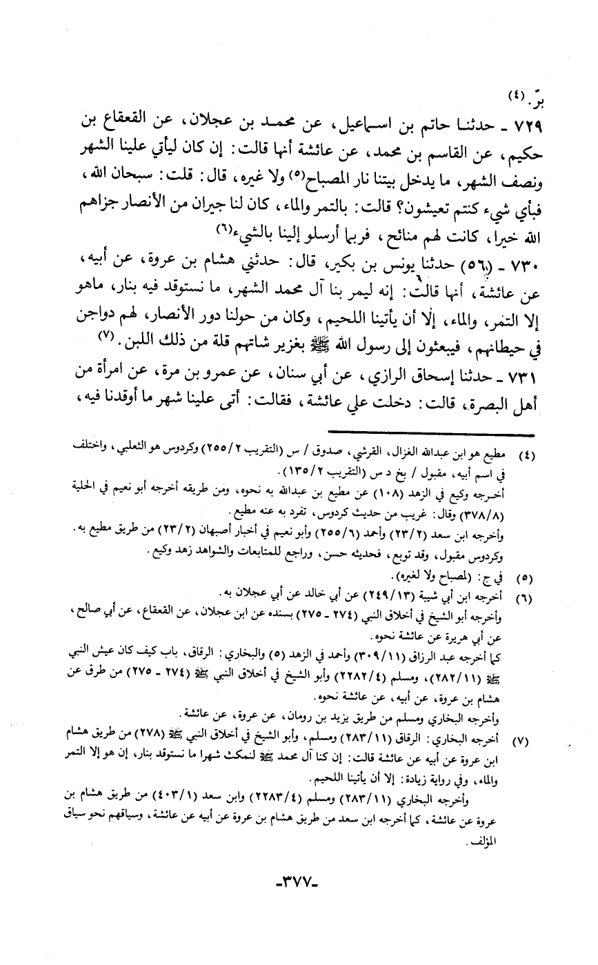 حَدَّثَنَا حَاتِمُ بْنُ إِسْمَاعِيلَ، عَنْ مُحَمَّدِ بْنِ عَجْلَانَ، عَنِ الْقَعْقَاعِ بْنِ حَكِيمٍ، عَنِ الْقَاسِمِ بْنِ مُحَمَّدٍ، عَنْ عَائِشَةَ أَنَّهَا قَالَتْ: " §إِنْ كَانَ لَيَأْتِي عَلَيْنَا الشَّهْرُ وَنِصْفُ الشَّهْرِ مَا يَدْخُلُ بَيْتَنَا نَارُ الْمِصْبَاحِ وَلَا غَيْرُهُ. قَالَ: قُلْتُ: سُبْحَانَ اللَّهِ فَبِأَيِّ شَيْءٍ كُنْتُمْ تَعِيشُونَ؟ قَالَتْ: بِالتَّمْرِ وَالْمَاءِ كَانَ لَنَا جِيرَانٌ مِنَ الْأَنْصَارِ جَزَاهُمُ اللَّهُ خَيْرًا كَانَتْ لَهُمْ مَنَائِحُ فَرُبَّمَا أَرْسَلُوا إِلَيْنَا بِالشَّيْءِ "