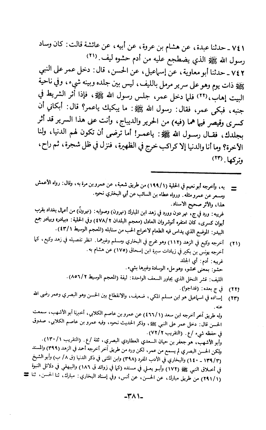 حَدَّثَنَا أَبُو مُعَاوِيَةَ، عَنْ إِسْمَاعِيلَ، عَنِ الْحَسَنِ قَالَ: دَخَلَ عُمَرُ عَلَى النَّبِيِّ صَلَّى اللهُ عَلَيْهِ وَسَلَّمَ ذَاتَ يَوْمٍ وَهُوَ عَلَى سَرِيرٍ مُرْمَلٍ بِاللِّيفِ لَيْسَ بَيْنَ جِلْدِهِ وَبَيْنَهُ شَيْءٌ , وَفِي نَاحِيَةِ الْبَيْتِ إِهَابٌ، فَلَمَّا دَخَلَ عُمَرُ جَلَسَ رَسُولُ اللَّهِ صَلَّى اللهُ عَلَيْهِ وَسَلَّمَ , فَإِذَا أَثَرُ الشَّرِيطِ فِي جَنْبِهِ , فَبَكَى عُمَرُ , فَقَالَ رَسُولُ اللَّهِ صَلَّى اللهُ عَلَيْهِ وَسَلَّمَ: " مَا يُبْكِيكَ يَا عُمَرُ؟ قَالَ: أَبْكَانِي أَنَّ كِسْرَى وَقَيْصَرَ فِيمَا هُمَا فِيهِ مِنَ الْحَرِيرِ وَالدِّيبَاجِ وَأَنْتَ عَلَى هَذَا السَّرِيرِ قَدْ أَثَّرَ بِجِلْدِكَ، فَقَالَ رَسُولُ اللَّهِ صَلَّى اللهُ عَلَيْهِ وَسَلَّمَ: «يَا عُمَرُ , §أَمَا تَرْضَى أَنْ تَكُونَ لَهُمُ الدُّنْيَا وَلَنَا الْآخِرَةُ , وَمَا أَنَا وَالدُّنْيَا إِلَّا كَرَاكِبٍ خَرَجَ فِي الظَّهِيرَةِ , فَنَزَلَ فِي ظِلِّ شَجَرَةٍ , ثُمَّ رَاحَ وَتَرَكَهَا»