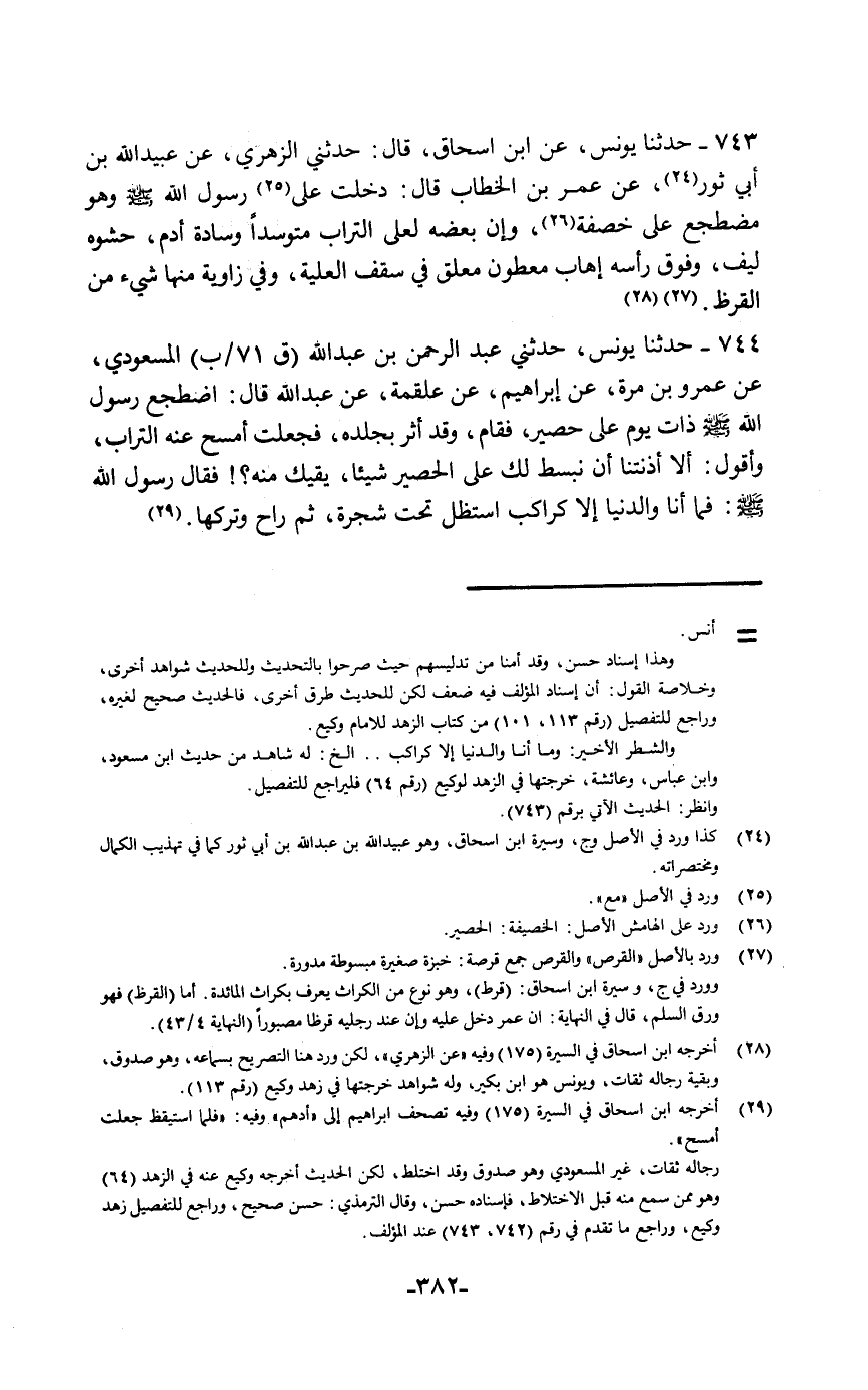 حَدَّثَنَا يُونُسُ، حَدَّثَنِي عَبْدُ الرَّحْمَنِ بْنُ عَبْدِ اللَّهِ الْمَسْعُودِيُّ، عَنْ عَمْرِو بْنِ مُرَّةَ، عَنْ إِبْرَاهِيمَ، عَنْ عَلْقَمَةَ، عَنْ عَبْدِ اللَّهِ قَالَ: اضْطَجَعَ رَسُولُ اللَّهِ صَلَّى اللهُ عَلَيْهِ وَسَلَّمَ ذَاتَ يَوْمٍ عَلَى حَصِيرٍ , فَقَامَ وَقَدْ أَثَّرَ بِجِلْدِهِ , فَجَعَلْتُ أَمْسَحُ عَنْهُ التُّرَابَ وَأَقُولُ: أَلَا آذَنْتَنَا أَنْ نَبْسُطَ لَكَ عَلَى الْحَصِيرِ شَيْئًا يَقِيكَ مِنْهُ؟ فَقَالَ رَسُولُ اللَّهِ صَلَّى اللهُ عَلَيْهِ وَسَلَّمَ: «§فَمَا أَنَا وَالدُّنْيَا إِلَّا كَرَاكِبٍ اسْتَظَلَّ تَحْتَ شَجَرَةٍ , ثُمَّ رَاحَ وَتَرْكَهَا»