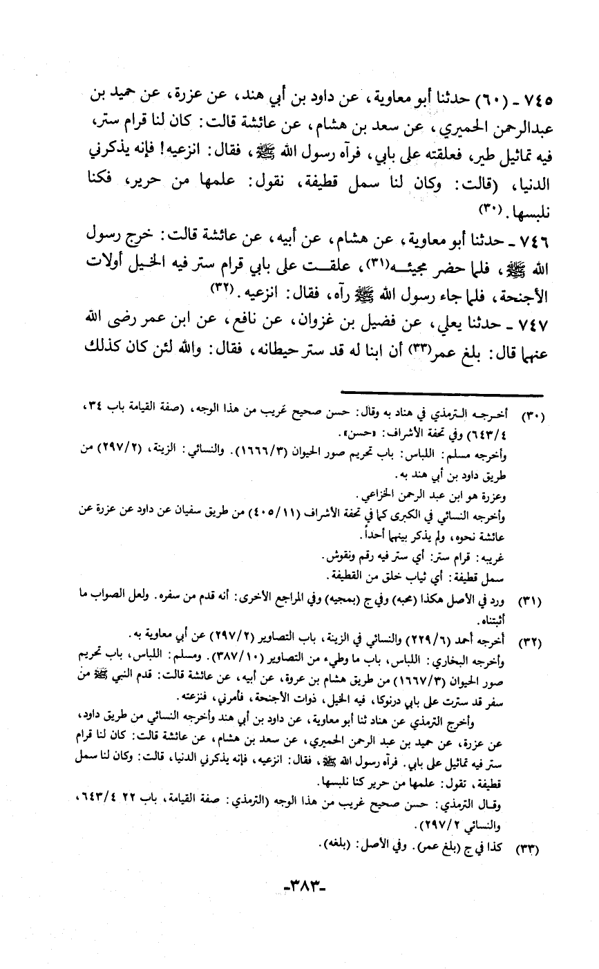 حَدَّثَنَا أَبُو مُعَاوِيَةَ، عَنْ دَاوُدَ بْنِ أَبِي هِنْدَ، عَنْ عَزْرَةَ، عَنْ حُمَيْدِ بْنِ عَبْدِ الرَّحْمَنِ الْحِمْيَرِيِّ، عَنْ سَعْدِ بْنِ هِشَامٍ، عَنْ عَائِشَةَ قَالَتْ: كَانَ لَنَا قِرَامُ سِتْرٍ، فِيهِ تَمَاثِيلُ طَيْرٍ , فَعَلَّقْتُهُ عَلَى بَابِي فَرَآهُ رَسُولُ اللَّهِ صَلَّى اللهُ عَلَيْهِ وَسَلَّمَ , فَقَالَ: «§انْزِعِيهِ فَإِنَّهُ يُذَكِّرُنِي الدُّنْيَا» قَالَتْ: " وَكَانَ لَنَا سَمَلُ قَطِيفَةٍ نَقُولُ: عَلَمُهَا مِنْ حَرِيرٍ , فَكُنَّا نَلْبَسُهَا "