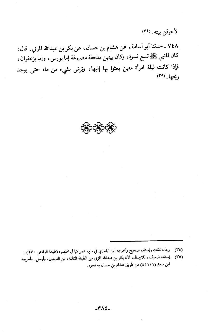 حَدَّثَنَا أَبُو أُسَامَةَ، عَنْ هِشَامِ بْنِ حَسَّانَ، عَنْ بَكْرِ بْنِ عَبْدِ اللَّهِ الْمُزَنِيِّ قَالَ: كَانَ لِلنَّبِيِّ صَلَّى اللهُ عَلَيْهِ وَسَلَّمَ تِسْعُ نِسْوَةٍ , وَكَانَ §بَيْنَهُنَّ مِلْحَفَةٌ مَصْبُوغَةٌ إِمَّا بِوَرْسٍ وَإِمَّا بِزَعْفَرَانٍ فَإِذَا كَانَتْ لَيْلَةُ امْرَأَةٍ مِنْهُنَّ بَعَثُوا بِهَا إِلَيْهَا وَتُرَشُّ بِشَيْءٍ مِنْ مَاءٍ حَتَّى يُوجَدَ رِيحُهَا "