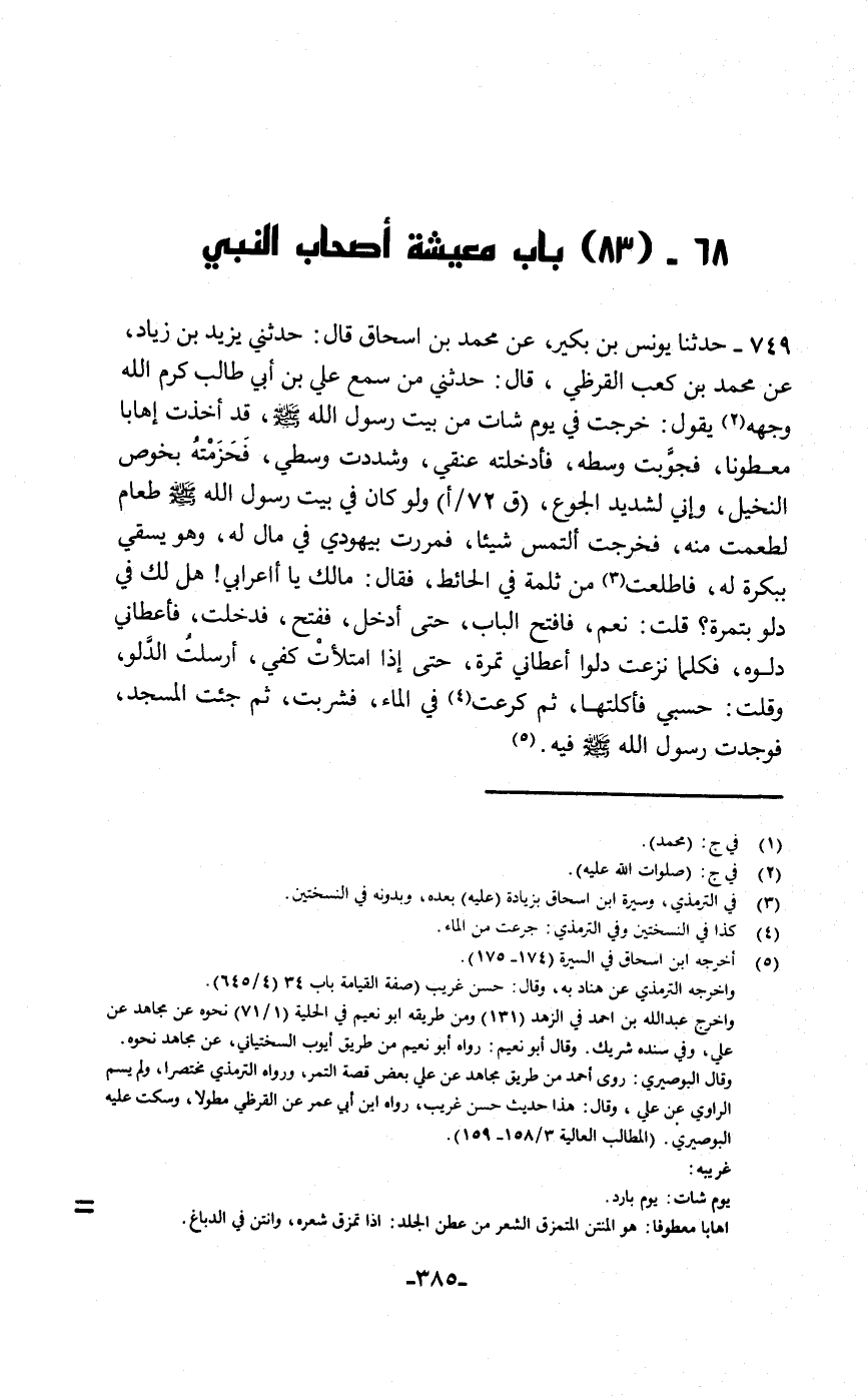 حَدَّثَنَا يُونُسُ بْنُ بُكَيْرٍ، عَنْ مُحَمَّدِ بْنِ إِسْحَاقَ قَالَ: حَدَّثَنِي يَزِيدُ بْنُ زِيَادٍ، عَنْ مُحَمَّدِ بْنِ كَعْبٍ الْقُرَظِيِّ قَالَ: حَدَّثَنِي مَنْ سَمِعَ عَلِيَّ بْنَ أَبِي طَالِبٍ كَرَّمَ اللَّهُ وَجْهَهُ يَقُولُ: " خَرَجْتُ فِي يَوْمٍ شَاتٍ مِنْ بَيْتِ رَسُولِ اللَّهِ صَلَّى اللهُ عَلَيْهِ وَسَلَّمَ قَدْ أَخَذْتُ إِهَابًا مَعْطُونًا فَجَوَّبْتُ وَسَطَهُ , فَأَدْخَلْتُهُ عُنُقِي , وَشَدَدْتُ وَسَطِي فَحَزَمْتُهُ بِخُوصِ النَّخِيلِ , وَإِنِّي لَشَدِيدُ الْجُوعِ وَلَوْ كَانَ فِي بَيْتِ رَسُولِ اللَّهِ صَلَّى اللهُ عَلَيْهِ وَسَلَّمَ طَعَامٌ لَطَعِمْتُ مِنْهُ فَخَرَجْتُ أَلْتَمِسُ شَيْئًا فَمَرَرْتُ بِيَهُودِيٍّ فِي مَالٍ لَهُ وَهُوَ يَسْقِي بِبَكَرَةٍ لَهُ فَاطَّلَعْتُ مِنْ ثُلْمَةٍ فِي الْحَائِطِ , فَقَالَ: مَا لَكَ يَا أَعْرَابِيُّ , هَلْ لَكَ فِي §دَلْوٍ بِتَمْرَةٍ؟ قُلْتُ: نَعَمْ، فَافْتَحِ الْبَابَ حَتَّى أَدْخُلَ فَفَتَحَ، فَدَخَلْتُ فَأَعْطَانِي دَلْوَهُ فَكُلَّمَا نَزَعْتُ دَلْوًا أَعْطَانِي تَمْرَةً حَتَّى إِذَا امْتَلَأَتْ كَفِّي أَرْسَلْتُ الدَّلْوَ وَقُلْتُ: حَسْبِي فَأَكَلْتُهَا , ثُمَّ كَرَعْتُ فِي الْمَاءِ فَشَرِبْتُ , ثُمَّ جِئْتُ الْمَسْجِدَ , فَوَجَدْتُ رَسُولَ اللَّهِ صَلَّى اللهُ عَلَيْهِ وَسَلَّمَ فِيهِ "