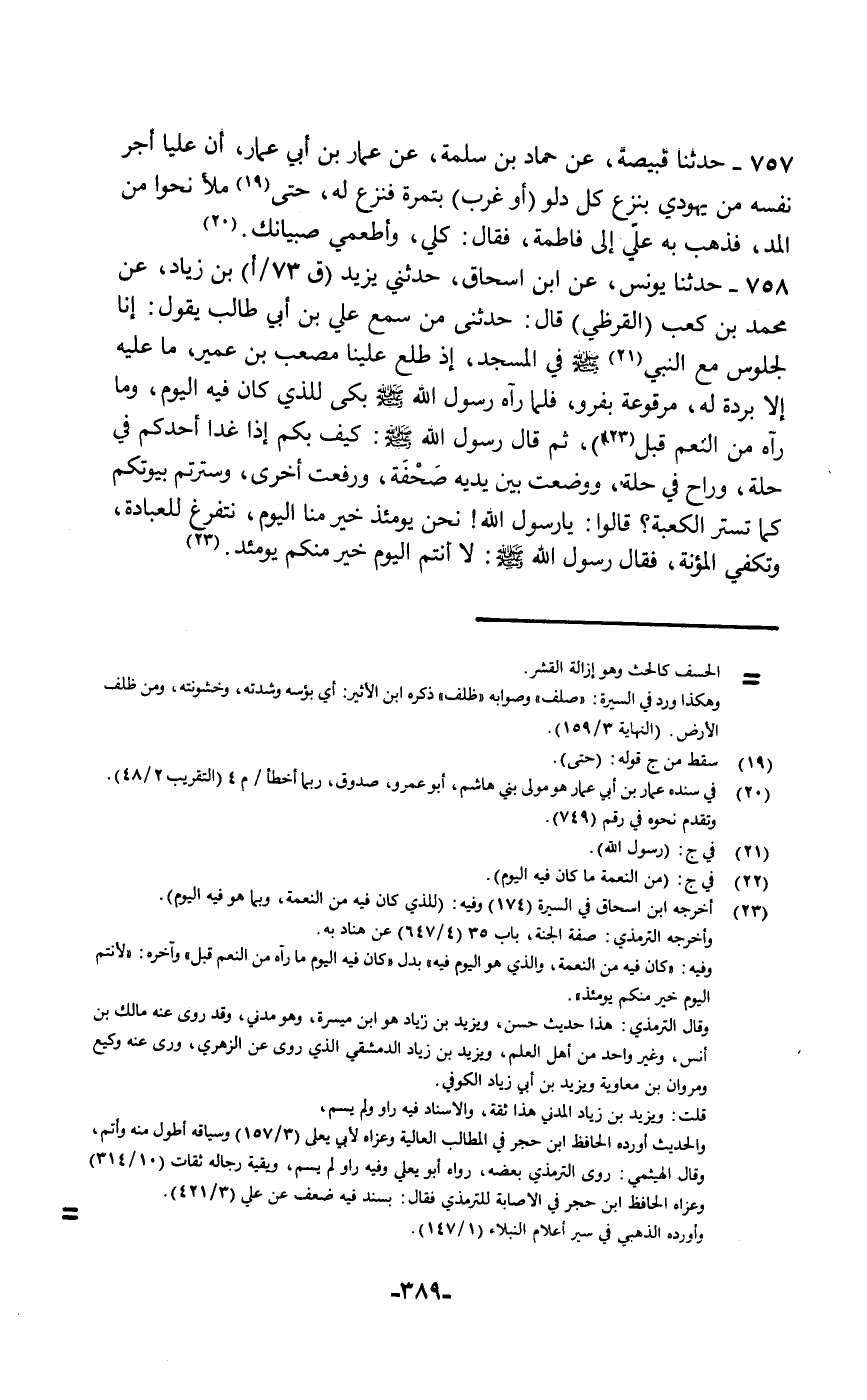 حَدَّثَنَا قَبِيصَةُ، عَنْ حَمَّادِ بْنِ سَلَمَةَ، عَنْ عَمَّارِ بْنِ أَبِي عَمَّارٍ أَنَّ عَلِيًّا §أَجَّرَ نَفْسَهُ مِنْ يَهُودِيٍّ بِنَزْعِ كُلِّ دَلْو أَوْ غَرْبٍ بِتَمْرَةٍ , فَنَزَعَ لَهُ حَتَّى مَلَأَ نَحْوًا مِنَ الْمُدِّ , فَذَهَبَ بِهِ عَلِيٌّ إِلَى فَاطِمَةَ , فَقَالَ: «كُلِي وَأَطْعِمِي صِبْيَانَكِ»