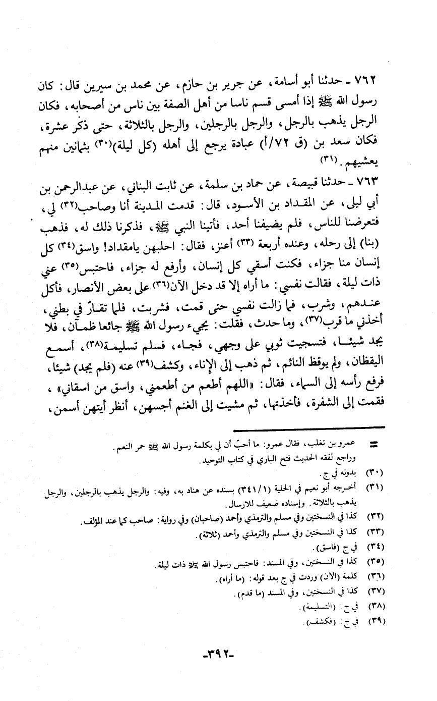 حَدَّثَنَا قَبِيصَةُ، عَنْ حَمَّادِ بْنِ سَلَمَةَ، عَنْ ثَابِتٍ الْبُنَانِيِّ، عَنْ عَبْدِ الرَّحْمَنِ بْنِ أَبِي لَيْلَى، عَنِ الْمِقْدَادِ بْنِ الْأَسْوَدِ قَالَ: قَدِمْتُ الْمَدِينَةَ أَنَا وَصَاحِبٌ لِي فَتَعَرَّضْنَا لِلنَّاسِ فَلَمْ يُضِيِّفْنَا أَحَدٌ , فَأَتَيْنَا النَّبِيَّ صَلَّى اللهُ عَلَيْهِ وَسَلَّمَ , فَذَكَرْنَا ذَلِكَ لَهُ , فَذَهَبَ بِنَا إِلَى رَحْلِهِ وَعِنْدَهُ أَرْبَعَةُ أَعْنُزٍ , فَقَالَ: «احْلِبْهُنَّ يَا مِقْدَادُ , وَاسْقِ كُلَّ إِنْسَانٍ مِنَّا جَزَاءً» . فَكُنْتُ أَسْقِي كُلَّ إِنْسَانٍ وَأَرْفَعَ لَهُ جَزَاءً فَاحْتَبَسَ عَنِّي ذَاتَ لَيْلَةٍ , فَقَالَتْ نَفْسِي مَا أُرَاهُ إِلَّا قَدْ دَخَلَ الْآنَ عَلَى بَعْضِ الْأَنْصَارِ فَأَكَلَ عِنْدَهُمْ وَشَرِبَ، فَمَا زَالَتْ نَفْسِي حَتَّى قُمْتُ فَشَرِبْتُ، فَلَمَّا تَقَارَّ فِي بَطْنِي أَخَذَنِي مَا قَرُبَ وَمَا حَدَثَ , فَقُلْتُ: يَجِيءُ رَسُولُ اللَّهِ صَلَّى اللهُ عَلَيْهِ وَسَلَّمَ جَائِعًا ظَمْآنَ فَلَا يَجِدُ شَيْئًا فَتَسَجَّيْتُ ثَوْبِي عَلَى وَجْهِي , فَجَاءَ فَسَلَّمَ تَسْلِيمَةً أَسْمَعَ الْيَقْظَانَ وَلَمْ يُوقِظِ النَّائِمَ , ثُمَّ ذَهَبَ إِلَى الْإِنَاءِ وَكَشَفَ عَنْهُ فَلَمْ يَجِدْ شَيْئًا , فَرَفَعَ رَأْسَهُ إِلَى السَّمَاءِ , فَقَالَ: «§اللَّهُمَّ أَطْعِمْ مَنْ أَطْعَمَنِي , وَاسْقِ مَنْ أَسْقَانِي» . فَقُمْتُ إِلَى الشَّفْرَةِ فَأَخَذْتُهَا , ثُمَّ مَشَيْتُ إِلَى الْغَنَمِ أَجُسُّهُنَّ أَنْظُرُ أَيَّتَهُنَّ أَسْمَنُ -[393]- فَأَذْبَحُهَا , فَوَقَعَتْ يَدِي عَلَى ضَرْعِ إِحْدَاهُنَّ فَإِذَا هِيَ حَافِلٌ , فَأَدْنَيْتُ الْإِنَاءَ فَاحْتَلَبْتُ , ثُمَّ قُلْتُ: هَاكَ فَاشْرَبْ يَا رَسُولَ اللَّهِ , فَقَالَ: «يَا مِقْدَادُ , مَا هَذَا» ؟ قُلْتُ: اشْرَبْ، , ثُمَّ أُخْبِرُكَ , فَقَالَ: «بَعْضُ سَوْآتِكَ» ، ثُمَّ شَرِبَ