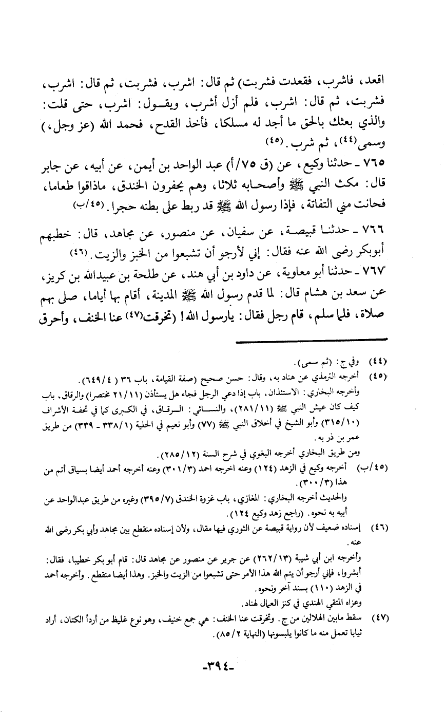 حَدَّثَنَا وَكِيعٌ، عَنْ عَبْدِ الْوَاحِدِ بْنِ أَيْمَنَ، عَنْ أَبِيهِ، عَنْ جَابِرٍ قَالَ: «مَكَثَ النَّبِيُّ صَلَّى اللهُ عَلَيْهِ وَسَلَّمَ وَأَصْحَابُهُ ثَلَاثًا وَهُمْ يَحْفِرُونَ الْخَنْدَقَ مَا ذَاقُوا طَعَامًا , فَحَانَتْ مِنِّي الْتِفَاتَةٌ , فَإِذَا رَسُولِ اللَّهِ صَلَّى اللهُ عَلَيْهِ وَسَلَّمَ قَدْ §رَبَطَ عَلَى بَطْنِهِ حَجَرًا»