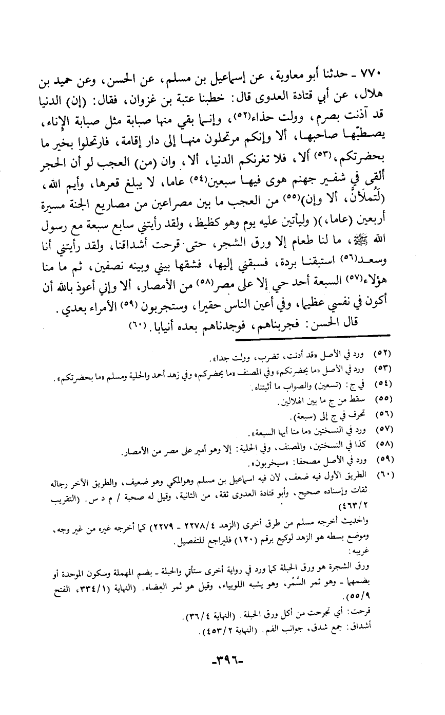 حَدَّثَنَا أَبُو مُعَاوِيَةَ، عَنْ إِسْمَاعِيلَ بْنِ مُسْلِمٍ، عَنِ الْحَسَنِ، وَعَنْ حُمَيْدِ بْنِ هِلَالٍ أَبِي قَتَادَةَ الْعَدَوِيِّ قَالَ: خَطَبَنَا عُتْبَةُ بْنُ غَزْوَانَ , فَقَالَ: «إِنَّ §الدُّنْيَا قَدْ آذَنَتْ بِصَرْمٍ وَوَلَّتْ حِذَاءً وَإِنَّمَا بَقِيَ مِنْهَا صُبَابَةٌ مِثْلُ صُبَابَةِ الْإِنَاءِ يَصْطَبُّهَا صَاحِبُهَا , أَلَا وَإِنَّكُمْ مُرْتَحِلُونَ مِنْهَا إِلَى دَارِ إِقَامَةٍ , فَارْتَحِلُوا بِخَيْرِ مَا بِحَضْرَتِكُمْ، أَلَا فَلَا تَغُرَّنَّكُمُ الدُّنْيَا , أَلَا وَإِنَّ مِنَ الْعَجَبِ لَوْ أَنَّ الْحَجَرَ أُلْقِيَ فِي شَفِيرِ جَهَنَّمَ هَوَى فِيهَا سَبْعِينَ عَامًا لَا يَبْلُغُ قَعْرَهَا، وَايْمُ اللَّهِ لَتُمْلَأَنَّ، أَلَا وَإِنَّ مِنَ الْعَجَبِ مَا بَيْنَ مِصْرَاعَيْنِ مِنْ مَصَارِيعِ الْجَنَّةِ مَسِيرَةَ أَرْبَعِينَ عَامًا , وَلَيَأْتِيَنَّ عَلَيْهِ يَوْمٌ وَهُوَ كَظِيظٌ، وَلَقَدْ رَأَيْتُنِي سَابِعَ سَبْعَةٍ مَعَ رَسُولِ اللَّهِ صَلَّى اللهُ عَلَيْهِ وَسَلَّمَ مَا لَنَا طَعَامٌ إِلَّا وَرَقُ الشَّجَرِ حَتَّى قَرِحَتْ أَشْدَاقُنَا، وَلَقَدْ رَأَيْتُنِي أَنَا وَسَعْدٌ اسْتَبَقْنَا بُرْدَةً فَسَبَقَنِي إِلَيْهَا فَشَقَّهَا بَيْنِي وَبَيْنَهُ نِصْفَيْنِ، ثُمَّ مَا مِنَّا هَؤُلَاءِ السَّبْعَةِ أَحَدٌ حَيُّ إِلَّا عَلَى مِصْرٍ مِنَ الْأَمْصَارِ , أَلَا وَإِنِّي أَعُوذُ بِاللَّهِ أَنْ أَكُونَ فِي نَفْسِي عَظِيمًا وَفِي أَعْيُنِ النَّاسِ حَقِيرًا , وَسَتُجَرِّبُونَ الْأُمَرَاءَ بَعْدِي» قَالَ الْحَسَنُ: فَجَرَّبْنَاهُمْ فَوَجَدْنَاهُمْ بَعْدَهُ أَنْيَابًا