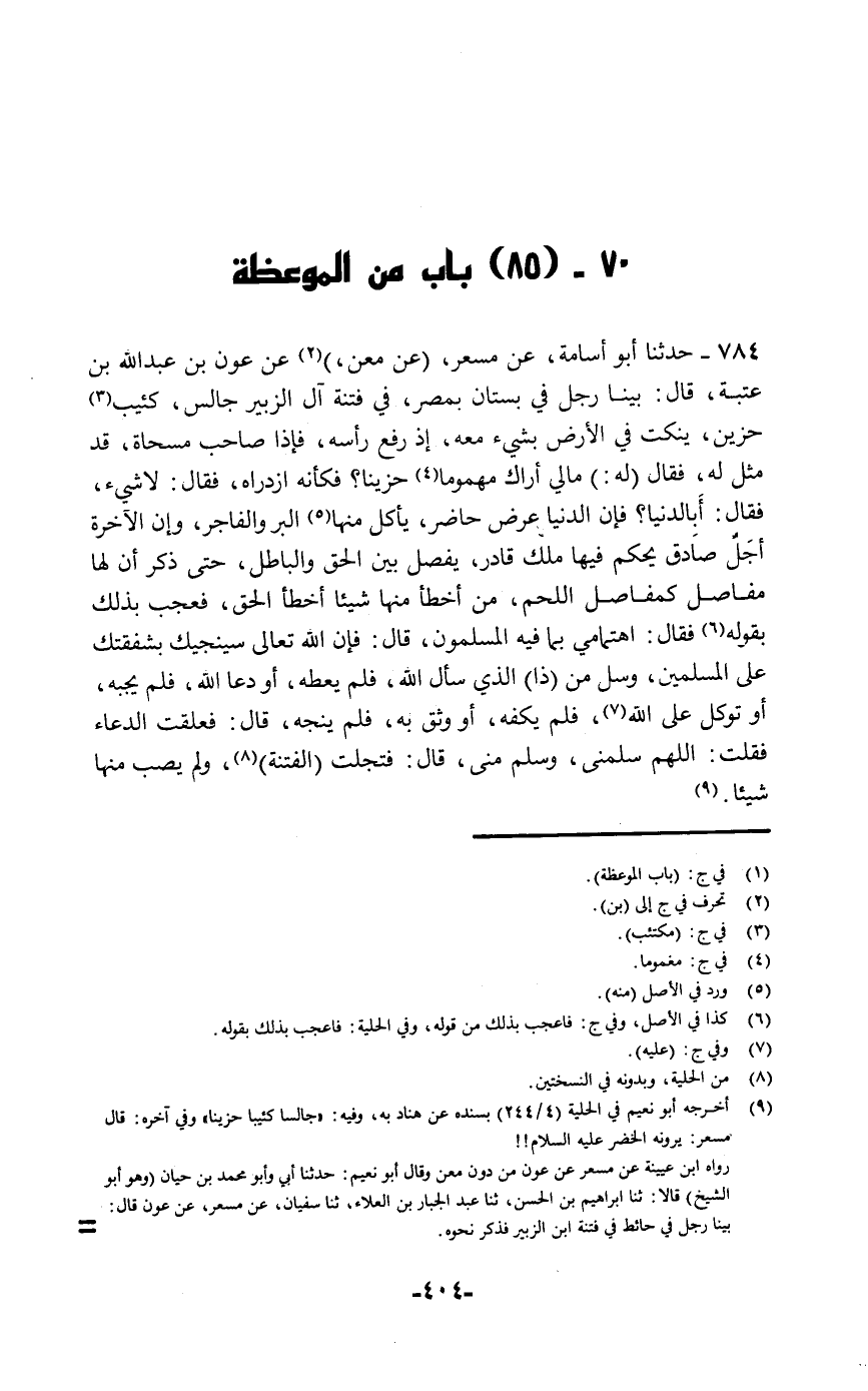 حَدَّثَنَا أَبُو أُسَامَةَ، عَنْ مِسْعَرٍ، عَنْ مَعْنٍ، عَنْ عَوْنِ بْنِ عَبْدِ اللَّهِ بْنِ عُتْبَةَ قَالَ: بَيْنَا رَجُلٌ فِي بُسْتَانٍ بِمِصْرَ فِي فِتْنَةِ آلِ الزُّبَيْرِ جَالِسٌ كَئِيبٌ حَزِينٌ يَنْكُتُ فِي الْأَرْضِ بِشَيْءٍ مَعَهُ إِذْ رَفَعَ رَأْسَهُ فَإِذَا صَاحِبُ مِسْحَاةٍ قَدْ مَثُلَ لَهُ , فَقَالَ لَهُ: مَالِي أَرَاكَ مَهْمُومًا حَزِينًا؟ فَكَأَنَّهُ ازْدَرَاهُ , فَقَالَ: «لَا شَيْءَ» ، فَقَالَ: أَبِالدُّنْيَا فَإِنَّ §الدُّنْيَا عَرَضٌ حَاضِرٌ يَأْكُلُ مِنْهَا الْبَرُّ وَالْفَاجِرُ , وَإِنَّ الْآخِرَةَ أَجَلٌ صَادِقٌ، يَحْكُمُ فِيهَا مَلِكٌ قَادِرٌ، يَفْصِلُ بَيْنَ الْحَقِّ وَالْبَاطِلِ، حَتَّى ذَكَرَ أَنَّ لَهَا مَفَاصِلَ كَمَفَاصِلِ اللَّحْمِ، مَنْ أَخْطَأَ مِنْهَا شَيْئًا أَخْطَأَ الْحَقَّ , فَعَجِبَ بِذَلِكَ بِقَوْلِهِ , فَقَالَ: «اهْتِمَامِي بِمَا فِيهِ الْمُسْلِمُونَ» قَالَ: فَإِنَّ اللَّهَ تَعَالَى سَيُنْجِيكَ بِشَفَقَتِكَ عَلَى الْمُسْلِمِينَ وَسَلْ مَنْ ذَا الَّذِي سَأَلَ اللَّهَ فَلَمْ يُعْطِهِ , أَوْ دَعَا اللَّهَ فَلَمْ يُجِبْهُ , أَوْ تَوَكَّلَ عَلَى اللَّهِ فَلَمْ يَكْفِهِ , أَوْ وَثِقَ بِهِ فَلَمْ يُنْجِهِ. قَالَ: " فَعَلَّقْتُ الدُّعَاءَ , فَقُلْتُ: اللَّهُمَّ سَلِّمْنِي وَسَلِّمْ مِنِّي " قَالَ: فَتَجَلَّتِ الْفِتْنَةُ وَلَمْ يُصِبْ مِنْهَا شَيْئًا
