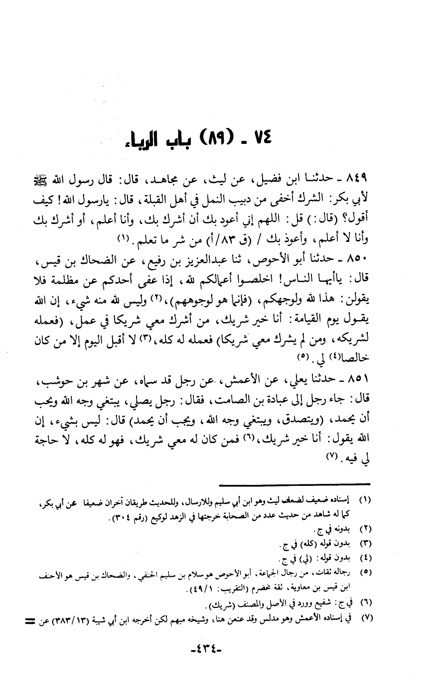 حَدَّثَنَا ابْنُ فُضَيْلٍ، عَنْ لَيْثٍ، عَنْ مُجَاهِدٍ قَالَ: قَالَ رَسُولُ اللَّهِ صَلَّى اللهُ عَلَيْهِ وَسَلَّمَ لِأَبِي بَكْرٍ: «§الشِّرْكُ أَخْفَى مِنْ دَبِيبِ النَّمْلِ فِي أَهْلِ الْقِبْلَةِ» قَالَ: يَا رَسُولَ اللَّهِ , كَيْفَ أَقُولُ؟ قَالَ: " قُلِ: اللَّهُمَّ , إِنِّي أَعُوذُ بِكَ أَنْ أُشْرِكَ بِكَ وَأَنَا أَعْلَمُ , أَوْ أُشْرِكَ بِكَ وَأَنَا لَا أَعْلَمُ , وَأَعُوذُ بِكَ مِنْ شَرِّ مَا تَعْلَمُ "