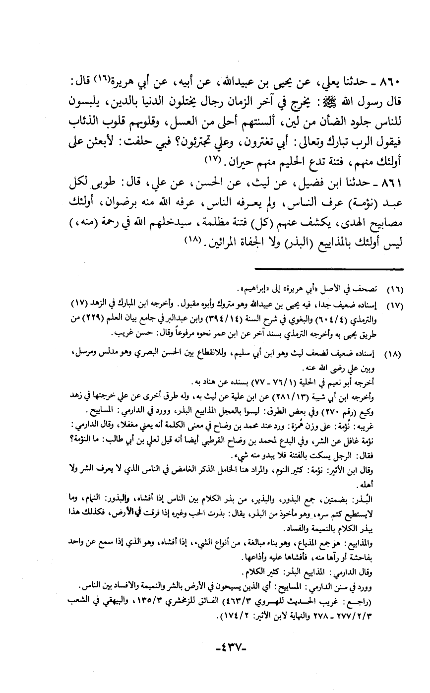 حَدَّثَنَا يَعْلَى، عَنْ يَحْيَى بْنِ عُبَيْدِ اللَّهِ، عَنْ أَبِيهِ، عَنْ أَبِي هُرَيْرَةَ قَالَ: قَالَ رَسُولُ اللَّهِ صَلَّى اللهُ عَلَيْهِ وَسَلَّمَ: " §يَخْرُجُ فِي آخِرِ الزَّمَانِ رِجَالٌ يَخْتِلُونَ الدُّنْيَا بِالدَّينَ , يَلْبَسُونَ لِلنَّاسِ جُلُودَ الضَّأْنِ , مِنْ لِينِ أَلْسِنَتِهِمْ أَحْلَى مِنَ الْعَسَلِ، وَقُلُوبُهُمْ قُلُوبُ الذِّئَابِ، فَيَقُولُ الرَّبُّ تَبَارَكَ وَتَعَالَى: أَبِي تَغْتَرُّونَ وَعَلَيَّ تَجْتَرِئُونَ فَبِي حَلَفْتُ لَأَبْعَثَنَّ عَلَى أُولَئِكَ مِنْهُمْ فِتْنَةً تَدَعُ الْحَلِيمَ مِنْهُمْ حَيْرَانَ "