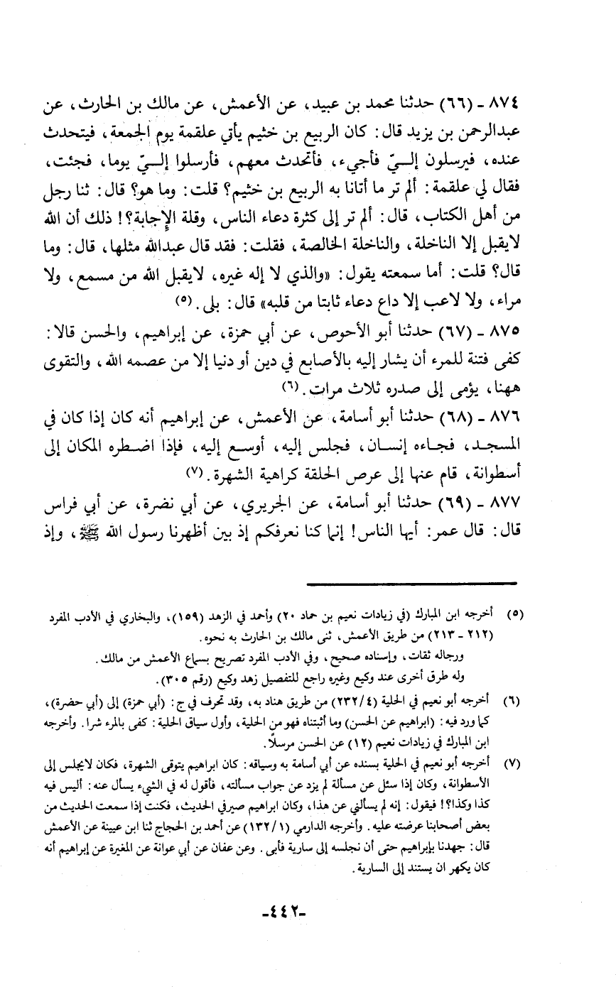 حَدَّثَنَا مُحَمَّدُ بْنُ عُبَيْدٍ، عَنِ الْأَعْمَشِ، عَنْ مَالِكِ بْنِ الْحَارِثِ، عَنْ عَبْدِ الرَّحْمَنِ بْنِ يَزِيدَ قَالَ: كَانَ الرَّبِيعُ بْنُ خُثَيْمٍ يَأْتِي عَلْقَمَةَ يَوْمَ الْجُمُعَةِ , فَيَتَحَدَّثُ عِنْدَهُ , فَيُرْسِلُونَ إِلَيَّ فَأَجِيءُ فَأَتَحَدَّثُ مَعَهُمْ , فَأَرْسَلُوا إِلَيَّ يَوْمًا فَجِئْتُ , فَقَالَ لِي عَلْقَمَةُ: أَلَمْ تَرَ مَا أَتَانَا بِهِ الرَّبِيعُ بْنُ خُثَيْمٍ؟ قُلْتُ: وَمَا هُوَ؟ قَالَ: ثنا رَجُلٌ مِنْ أَهْلِ الْكِتَابِ قَالَ: أَلَمْ تَرَ إِلَى كَثْرَةِ دُعَاءِ النَّاسِ وَقِلَّةِ الْإِجَابَةِ؛ ذَلِكَ أَنَّ اللَّهَ لَا يَقْبَلُ إِلَّا النَّاخِلَةَ وَالنَّاخِلَةُ الْخَالِصَةُ، فَقُلْتُ: فَقَدْ قَالَ عَبْدُ اللَّهِ مِثْلَهَا قَالَ: وَمَا قَالَ؟: قُلْتُ أَمَا سَمِعْتَهُ يَقُولُ: «وَالَّذِي لَا إِلَهَ غَيْرُهُ §لَا يَقْبَلُ اللَّهُ مِنْ مُسَمِّعٍ وَلَا مُرَاءٍ وَلَا لَاعِبٍ إِلَّا دَاعٍ دُعَاءً ثَابِتًا مِنْ قَلْبِهِ» قَالَ: بَلَى