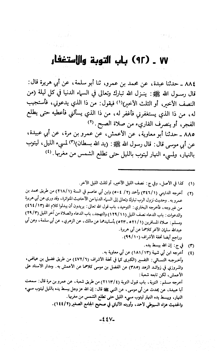 حَدَّثَنَا أَبُو مُعَاوِيَةَ، عَنِ الْأَعْمَشِ، عَنْ عَمْرِو بْنِ مُرَّةَ، عَنْ أَبِي عُبَيْدَةَ، عَنْ أَبِي مُوسَى قَالَ: قَالَ رَسُولُ اللَّهِ صَلَّى اللهُ عَلَيْهِ وَسَلَّمَ: «§يَدُ اللَّهِ بُسْطَانُ لِمُسِيءِ اللَّيْلِ لِيَتُوبَ بِالنَّهَارِ , وَلِمُسِيءِ النَّهَارِ لِيَتُوبَ بِاللَّيْلِ حَتَّى تَطْلُعَ الشَّمْسُ مِنْ مَغْرِبِهَا»