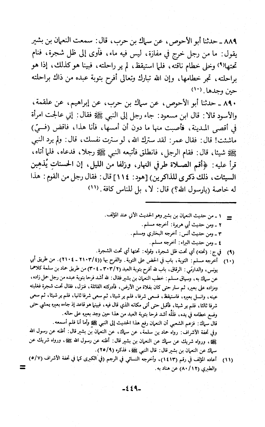 حَدَّثَنَا أَبُو الْأَحْوَصِ، عَنْ سِمَاكِ بْنِ حَرْبٍ قَالَ: سَمِعْتُ النُّعْمَانَ بْنَ بَشِيرٍ يَقُولُ: §مَا مِنْ رَجُلٍ خَرَجَ فِي مَفَازَةٍ لَيْسَ فِيهِ مَاءٌ , فَآوَى إِلَى ظِلِّ شَجَرَةٍ , فَنَامَ تَحْتَهَا , وَخَلَّى خِطَامَ نَاقَتِهِ، فَلَمَّا اسْتَيْقَظَ لَمْ يَرَ رَاحِلَتَهُ , فَبَيْنَا هُوَ كَذَلِكَ إِذَا هُوَ بِرَاحِلَتِهِ تَجُرُّ خِطَامَهَا وَإِنَّ اللَّهَ تَبَارَكَ وَتَعَالَى أَفْرَحُ بِتَوْبَةِ عَبْدِهِ مِنْ ذَاكَ بِرَاحِلَتِهِ حِينَ وَجَدَهَا "