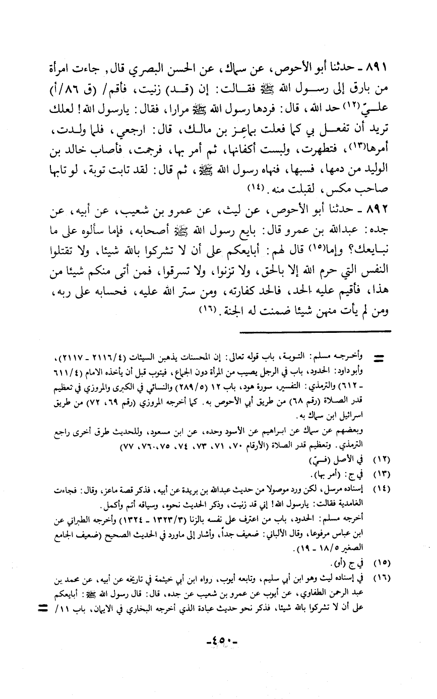 حَدَّثَنَا أَبُو الْأَحْوَصِ، عَنْ سِمَاكٍ، عَنِ الْحَسَنِ الْبَصْرِيِّ قَالَ: جَاءَتِ امْرَأَةٌ مِنْ بَارِقٍ إِلَى رَسُولِ اللَّهِ صَلَّى اللهُ عَلَيْهِ وَسَلَّمَ , فَقَالَتْ: إِنِّي قَدْ زَنَيْتُ , فَأَقِمْ عَلَيَّ حَدَّ اللَّهِ. قَالَ: فَرَدَّهَا رَسُولُ اللَّهِ صَلَّى اللهُ عَلَيْهِ وَسَلَّمَ مِرَارًا، فَقَالَتْ: يَا رَسُولَ اللَّهِ , لَعَلَّكَ تُرِيدُ أَنْ تَفْعَلَ بِي كَمَا فَعَلْتَ بِمَاعِزِ بْنِ مَالِكٍ قَالَ: «ارْجِعِي» , فَلَمَّا وَلَدَتْ أَمَرَهَا , فَتَطَهَّرْتُ , وَلَبِسَتْ أَكْفَانَهَا , ثُمَّ أَمَرَ بِهَا فَرُجِمَتْ فَأَصَابَ خَالِدُ بْنُ الْوَلِيدِ مِنْ دَمِهَا فَسَبَّهَا , فَنَهَاهُ رَسُولُ اللَّهِ صَلَّى اللهُ عَلَيْهِ وَسَلَّمَ , ثُمَّ قَالَ: «§لَقَدْ تَابَتْ تَوْبَةً لَوْ تَابَهَا صَاحِبُ مَكْسٍ لَقُبِلَتْ مِنْهُ»