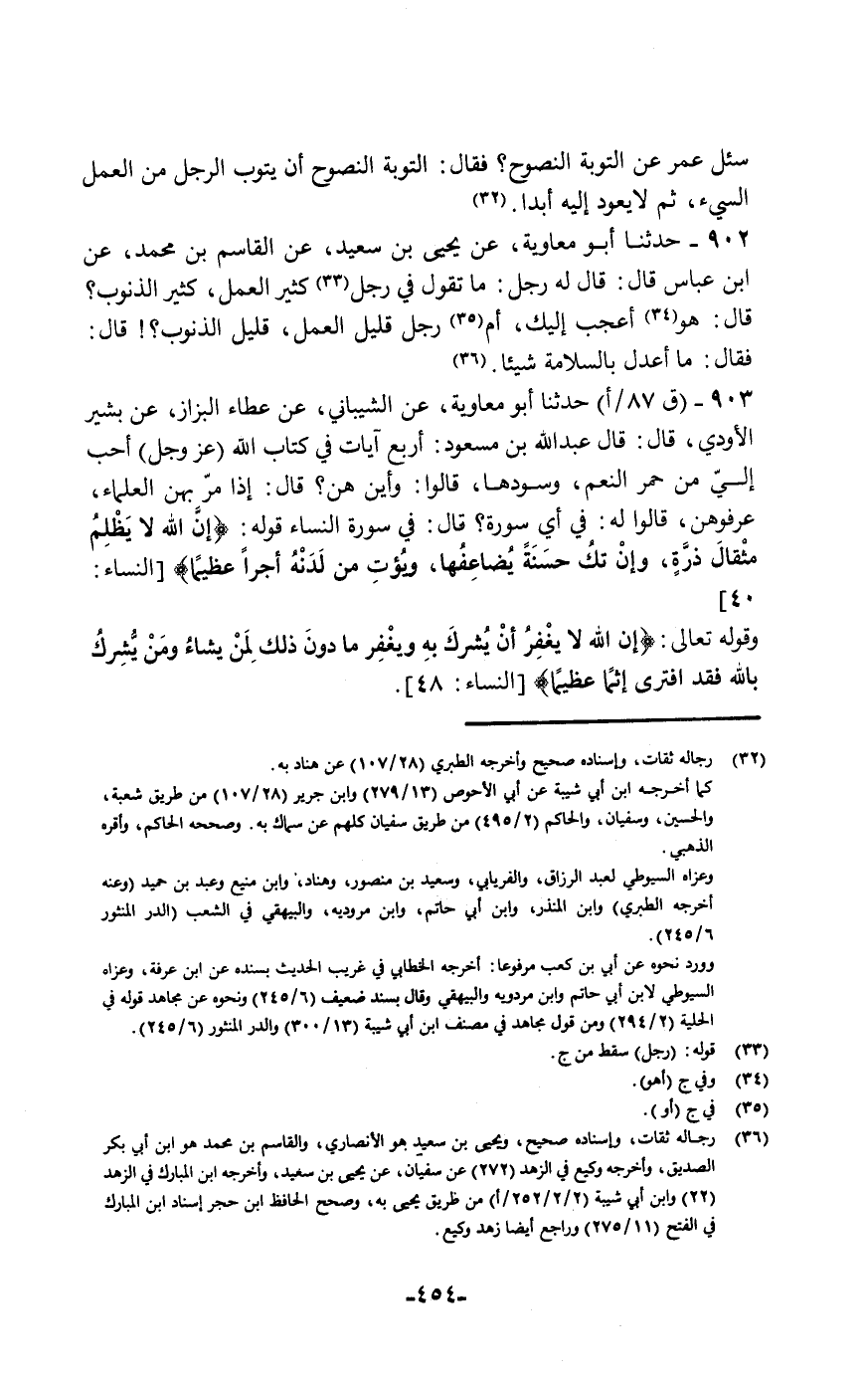 حَدَّثَنَا أَبُو مُعَاوِيَةَ، عَنِ الشَّيْبَانِيِّ، عَنْ عَطَاءٍ الْبَزَّازِ، عَنْ بَشِيرٍ الْأَوْدِيِّ قَالَ: قَالَ عَبْدُ اللَّهِ بْنُ مَسْعُودٍ: " §أَرْبَعُ آيَاتٍ فِي كِتَابِ اللَّهِ عَزَّ وَجَلَّ أَحَبُّ إِلَيَّ مِنْ حُمْرِ النَّعَمِ وَسُودِهَا. قَالُوا: وَأَيْنَ هُنَّ. قَالَ: إِذَا مَرَّ بِهِنَّ الْعُلَمَاءُ عَرَفُوهُنَّ، قَالُوا لَهُ: فِي أَيِّ سُورَةٍ؟ قَالَ: فِي سُورَةِ النِّسَاءِ قَوْلُهُ {إِنَّ اللَّهَ لَا يَظْلِمُ مِثْقَالَ ذَرَّةٍ وَإِنْ تَكُ حَسَنَةً يُضَاعِفْهَا وَيُؤْتِ مِنْ لَدُنْهُ أَجْرًا عَظِيمًا} [النساء: 40] "، وَقَوْلُهُ تَعَالَى {إِنَّ اللَّهَ لَا يَغْفِرُ أَنْ يُشْرَكَ بِهِ وَيَغْفِرُ مَا دُونَ ذَلِكَ لِمَنْ يَشَاءُ، وَمَنْ يُشْرِكْ بِاللَّهِ فَقَدِ افْتَرَى إِثْمًا عَظِيمًا} [النساء: 48]