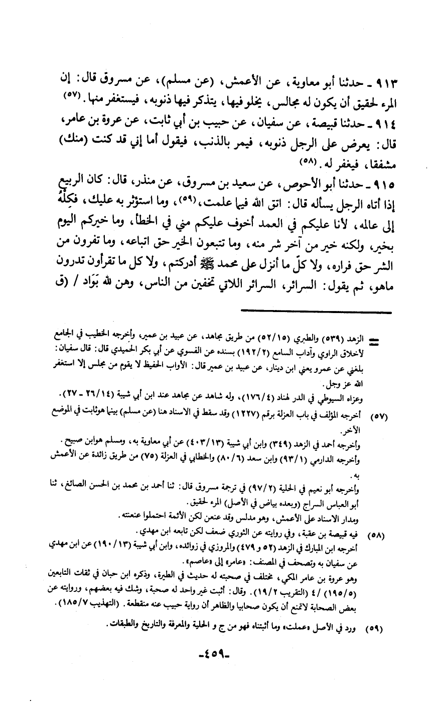 حَدَّثَنَا أَبُو مُعَاوِيَةَ، عَنِ الْأَعْمَشِ، عَنْ مُسْلِمٍ، عَنْ مَسْرُوقٍ قَالَ: «إِنَّ الْمَرْءَ لَحَقِيقٌ أَنْ يَكُونَ لَهُ مَجَالِسُ يَخْلُو فِيهَا §يَتَذَكَّرُ فِيهَا ذُنُوبَهُ فَيَسْتَغْفِرُ مِنْهَا»