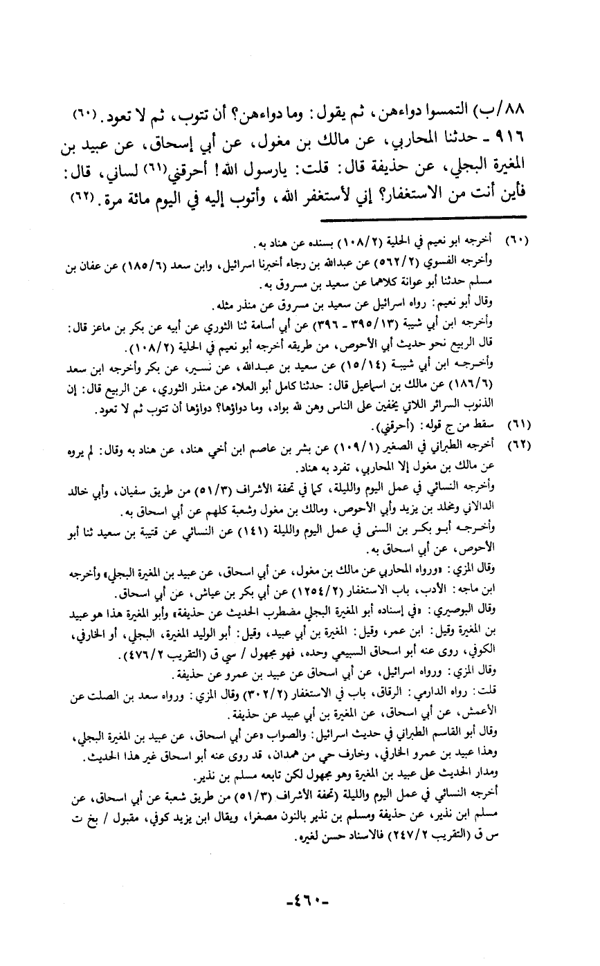 حَدَّثَنَا الْمُحَارِبِيُّ، عَنْ مَالِكِ بْنِ مِغْوَلٍ، عَنْ أَبِي إِسْحَاقَ، عَنْ عُبَيْدِ بْنِ الْمُغِيرَةِ الْبَجَلِيِّ، عَنْ حُذَيْفَةَ قَالَ: قُلْتُ: يَا رَسُولَ اللَّهِ , أَحْرَقَنِي لِسَانِي. قَالَ: «فَأَيْنَ أَنْتَ مِنَ الِاسْتِغْفَارِ، §إِنِّي لَأَسْتَغْفِرُ اللَّهَ وَأَتُوبُ إِلَيْهِ فِي الْيَوْمِ مِائَةَ مَرَّةٍ»