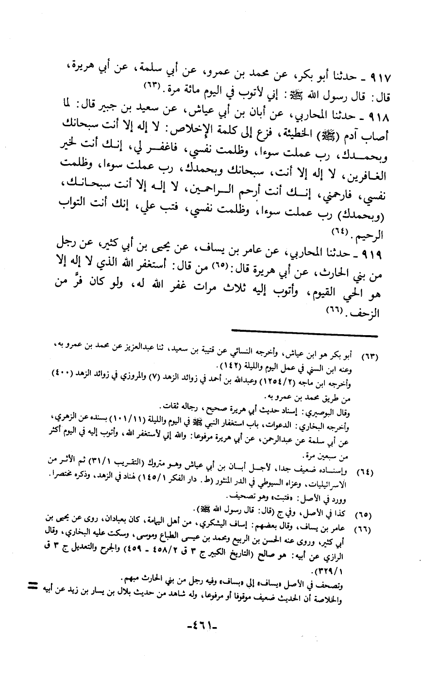 حَدَّثَنَا أَبُو بَكْرٍ، عَنْ مُحَمَّدِ بْنِ عَمْرٍو، عَنْ أَبِي سَلَمَةَ، عَنْ أَبِي هُرَيْرَةَ قَالَ: قَالَ رَسُولُ اللَّهِ صَلَّى اللهُ عَلَيْهِ وَسَلَّمَ: «§إِنِّي لَأَتُوبُ فِي الْيَوْمِ مِائَةَ مَرَّةٍ»