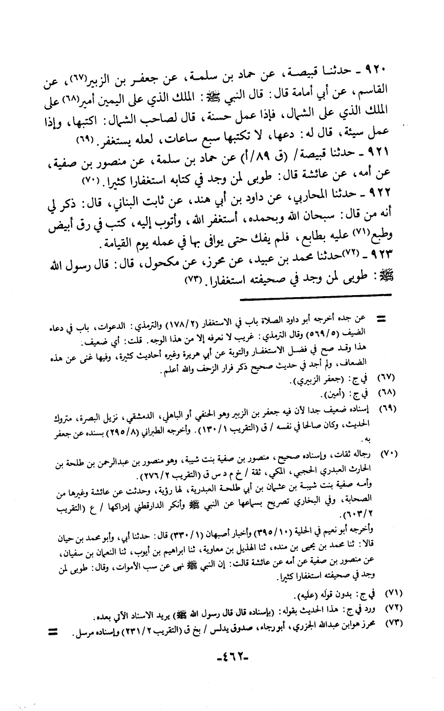 حَدَّثَنَا قَبِيصَةُ، عَنْ حَمَّادِ بْنِ سَلَمَةَ، عَنْ مَنْصُورِ بْنِ صَفِيَّةَ، عَنْ أُمِّهِ، عَنْ عَائِشَةَ قَالَ: «§طُوبَى لِمَنْ وَجَدَ فِي كِتَابِهِ اسْتِغْفَارًا كَثِيرًا»