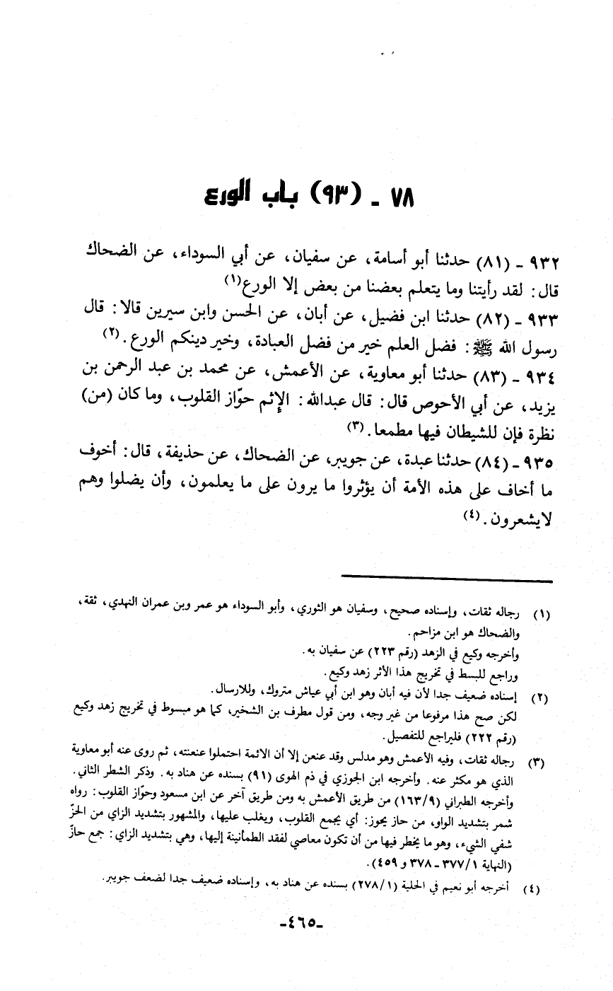 حَدَّثَنَا أَبُو أُسَامَةَ، عَنْ سُفْيَانَ، عَنْ أَبِي السَّوْدَاءِ، عَنِ الضَّحَّاكِ قَالَ: «لَقَدْ §رَأَيْتُنَا وَمَا يَتَعَلَّمُ بَعْضُنَا مِنْ بَعْضٍ إِلَّا الْوَرَعَ»