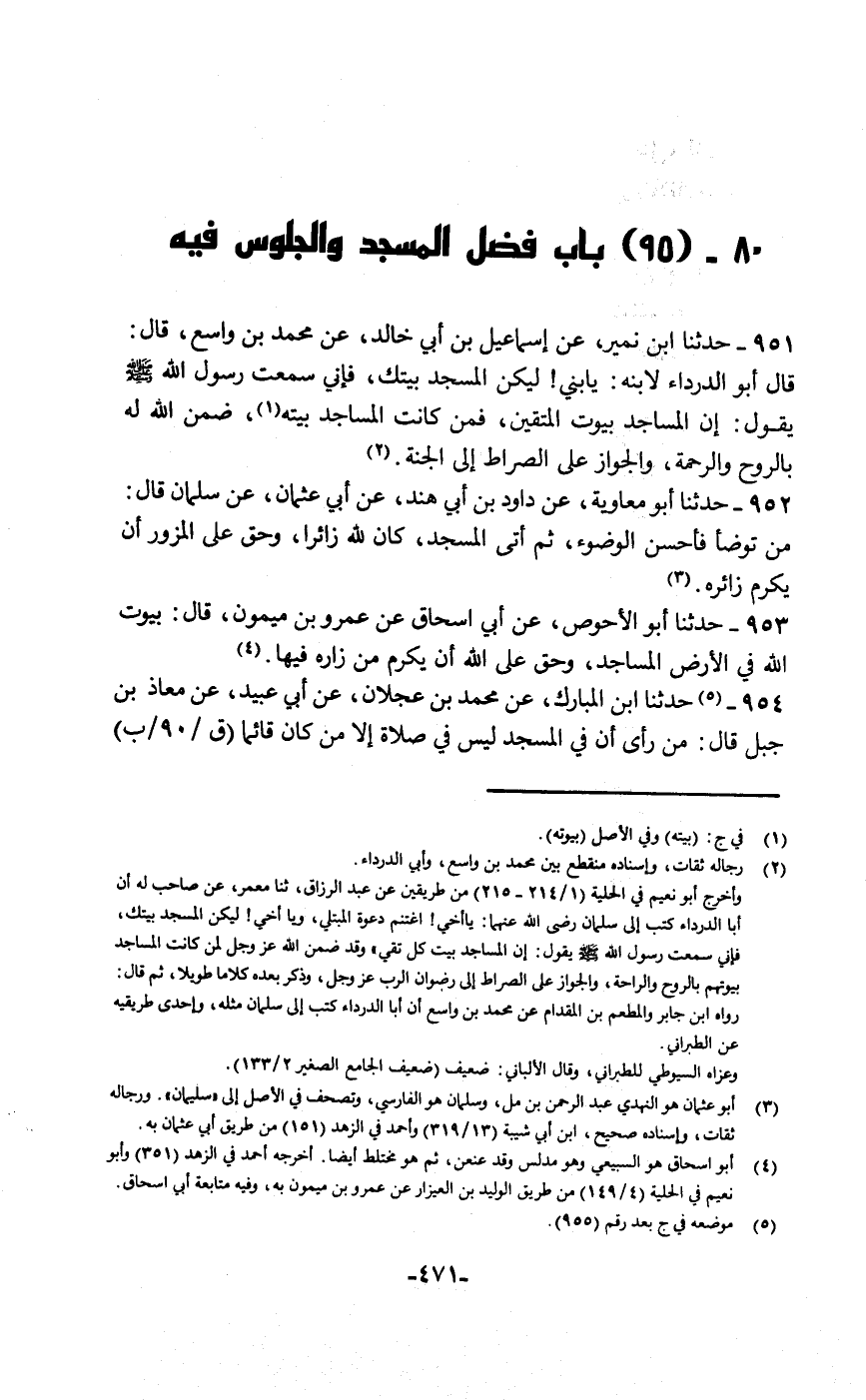 حَدَّثَنَا ابْنُ نُمَيْرٍ، عَنْ إِسْمَاعِيلَ بْنِ أَبِي خَالِدٍ، عَنْ مُحَمَّدِ بْنِ وَاسِعٍ قَالَ: قَالَ: أَبُو الدَّرْدَاءِ لِابْنِهِ: يَا بُنَيَّ , لِيَكُنِ الْمَسْجِدُ بَيْتَكَ؛ فَإِنِّي سَمِعْتُ رَسُولَ اللَّهِ صَلَّى اللهُ عَلَيْهِ وَسَلَّمَ يَقُولُ: «إِنَّ §الْمَسَاجِدَ بُيُوتُ الْمُتَّقِينَ، فَمَنْ كَانَتِ الْمَسَاجِدُ بَيْتَهُ ضَمِنَ اللَّهُ لَهُ بِالرَّوْحِ وَالرَّحْمَةِ وَالْجَوَازِ عَلَى الصِّرَاطِ إِلَى الْجَنَّةِ»