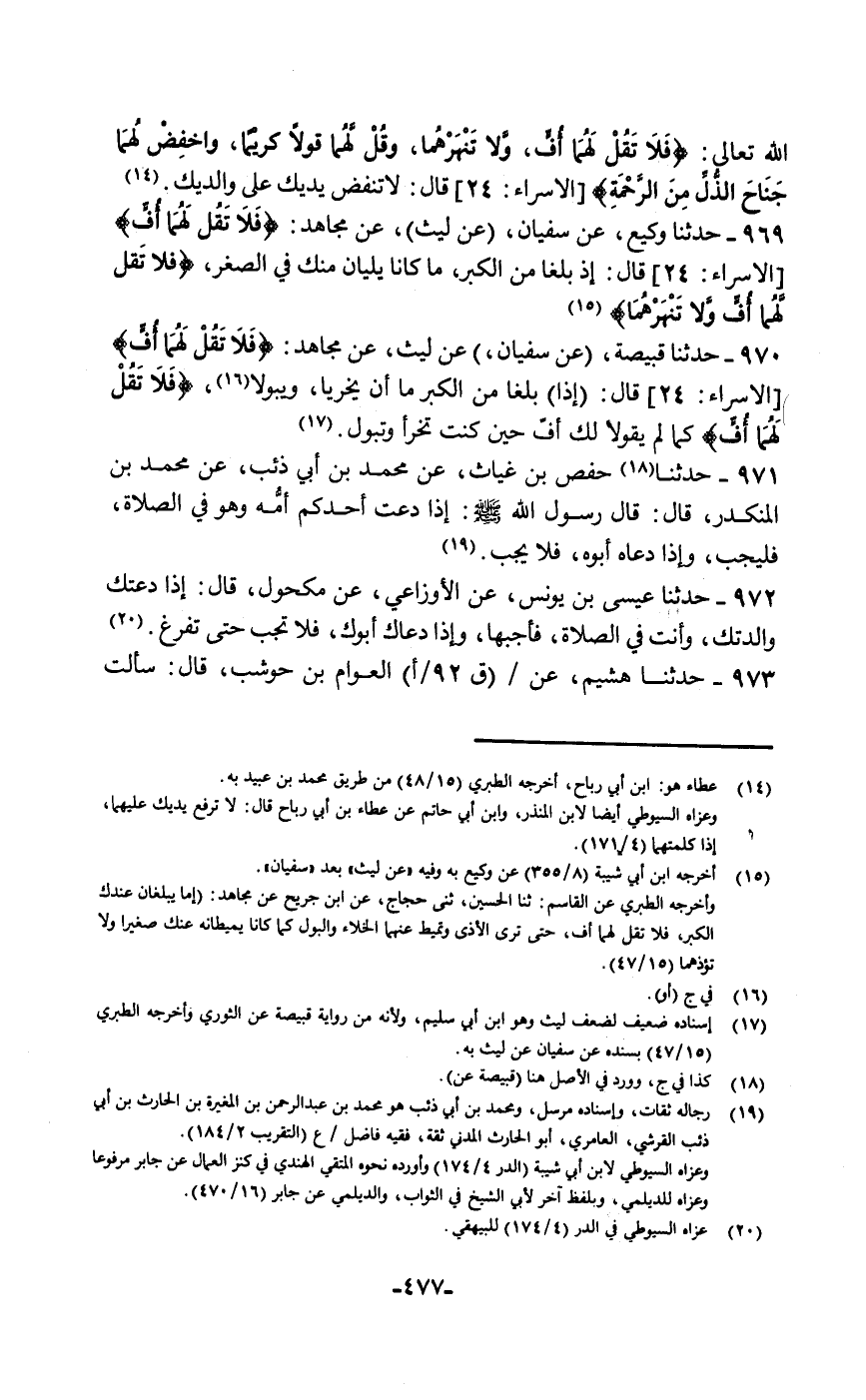 حَدَّثَنَا وَكِيعٌ، عَنْ سُفْيَانَ، عَنْ لَيْثٍ، عَنْ مُجَاهِدٍ: {§فَلَا تَقُلْ لَهُمَا أُفٍّ} [الإسراء: 23] قَالَ: " إِذْ بَلَغَا مِنَ الْكِبْرِ مَا كَانَا يَلِيَانِ مِنْكَ فِي الصِّغَرِ {فَلَا تَقُلْ لَهُمَا أُفٍّ وَلَا تَنْهَرْهُمَا} [الإسراء: 23]