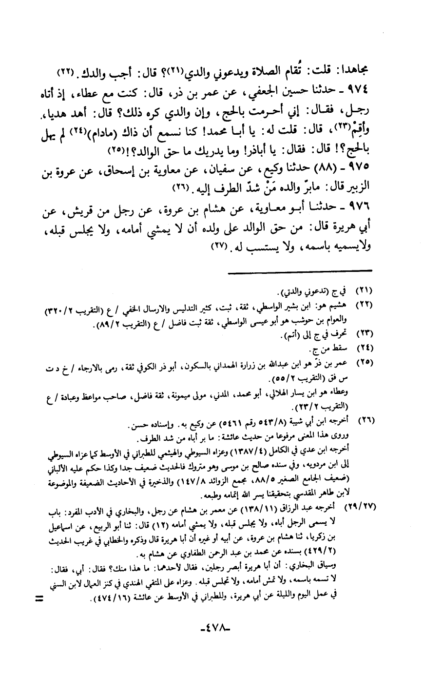 حَدَّثَنَا وَكِيعٌ، عَنْ سُفْيَانَ، عَنْ مُعَاوِيَةَ بْنِ إِسْحَاقَ، عَنْ عُرْوَةَ بْنِ الزُّبَيْرِ قَالَ: «§مَا بَرَّ وَالِدَهُ مَنْ شَدَّ الطَّرَفَ إِلَيْهِ»