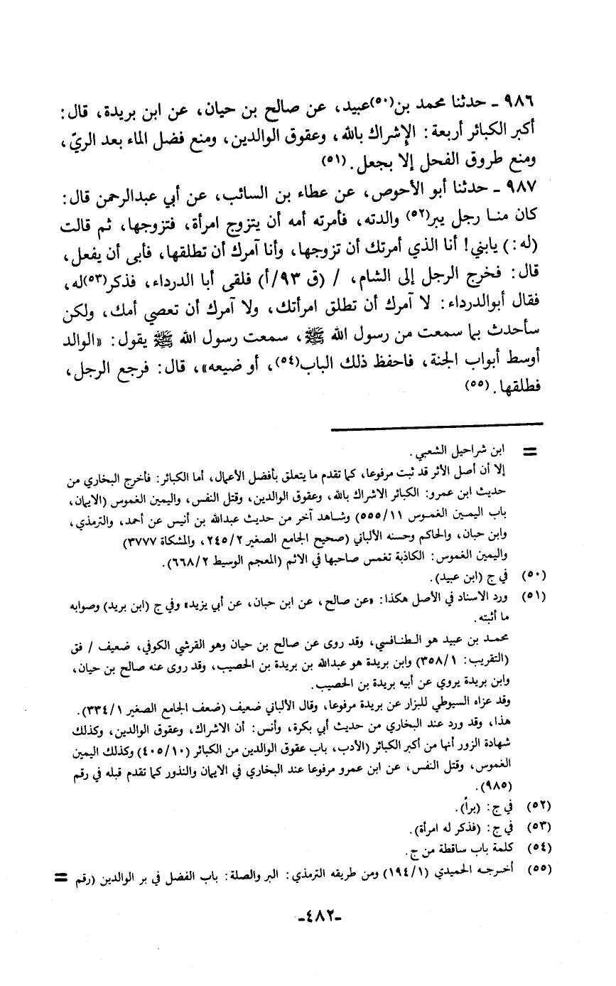 حَدَّثَنَا أَبُو الْأَحْوَصِ، عَنْ عَطَاءِ بْنِ السَّائِبِ، عَنْ أَبِي عَبْدِ الرَّحْمَنِ قَالَ: كَانَ مِنَّا رَجُلٌ يَبَرُّ وَالِدَتَهُ , فَأَمَرَتْهُ أُمُّهُ أَنْ يَتَزَوَّجَ امْرَأَةً فَتَزَوَّجَهَا، ثُمَّ قَالَتْ لَهُ: يَا بُنَيَّ , أَنَا الَّذِي أَمَرْتُكَ أَنْ تَزَوَّجَهَا وَأَنَا آمُرُكَ أَنْ تُطَلِّقَهَا، فَأَبَى أَنْ يَفْعَلَ. قَالَ: فَخَرَجَ الرَّجُلُ إِلَى الشَّامِ , فَلَقِيَ أَبَا الدَّرْدَاءِ فَذَكَرَ لَهُ، فَقَالَ أَبُو الدَّرْدَاءِ: لَا آمُرُكَ أَنْ تُطَلِّقَ امْرَأَتَكَ، وَلَا آمُرُكَ أَنْ تَعْصِيَ أُمَّكَ، وَلَكِنْ سَأُحَدِّثُ بِمَا سَمِعْتُ مِنَ رَسُولِ اللَّهِ صَلَّى اللهُ عَلَيْهِ وَسَلَّمَ، سَمِعْتُ رَسُولَ اللَّهِ صَلَّى اللهُ عَلَيْهِ وَسَلَّمَ يَقُولُ: «§الْوَالِدُ أَوْسَطُ أَبْوَابِ الْجَنَّةِ؛ فَاحْفَظْ ذَلِكَ الْبَابَ أَوْ ضَيِّعْهُ» قَالَ: فَرَجَعَ الرَّجُلُ فَطَلَّقَهَا