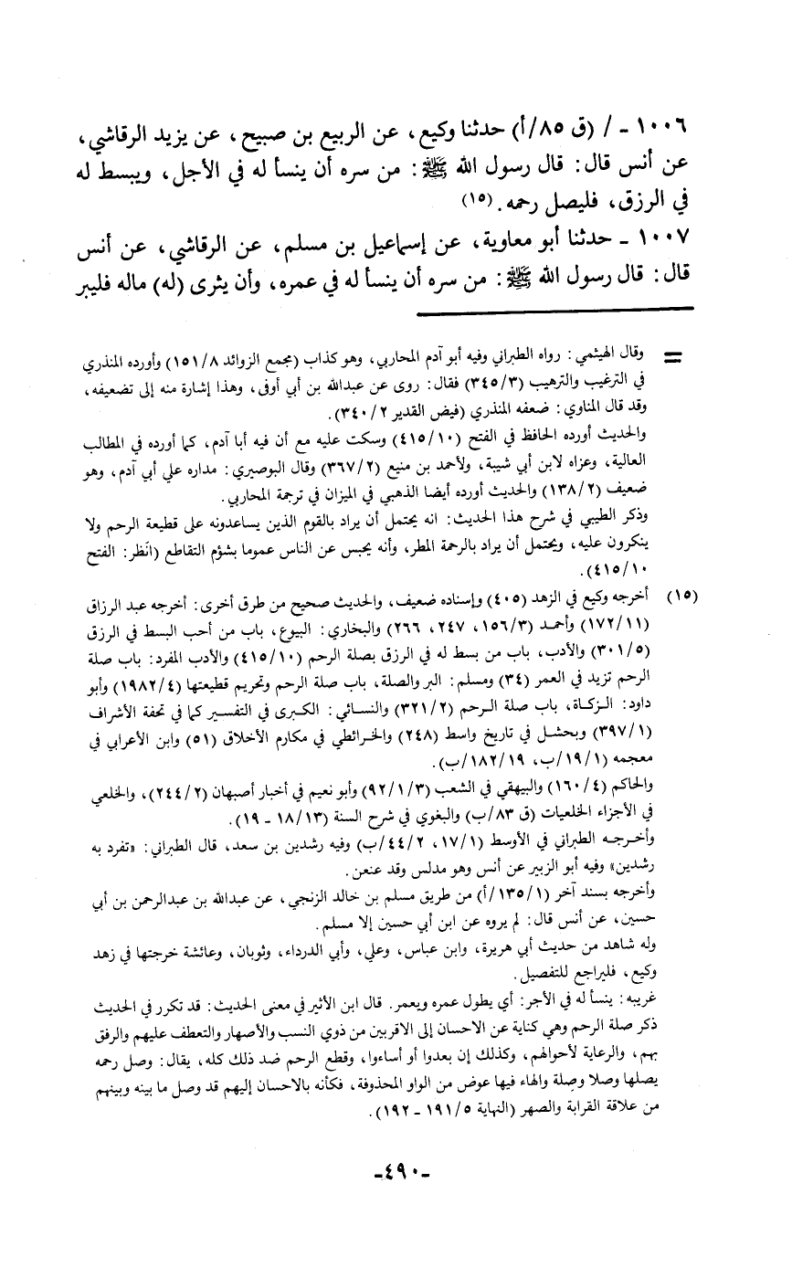 حَدَّثَنَا وَكِيعٌ، عَنِ الرَّبِيعِ بْنِ صُبَيْحٍ، عَنْ يَزِيدَ الرَّقَاشِيِّ، عَنْ أَنَسٍ قَالَ: قَالَ رَسُولُ اللَّهِ صَلَّى اللهُ عَلَيْهِ وَسَلَّمَ: «§مَنْ سَرَّهُ أَنْ يُنْسَأَ لَهُ فِي الْأَجَلِ وَيُبْسَطَ لَهُ فِي الرِّزْقِ فَلْيَصِلْ رَحِمَهُ»