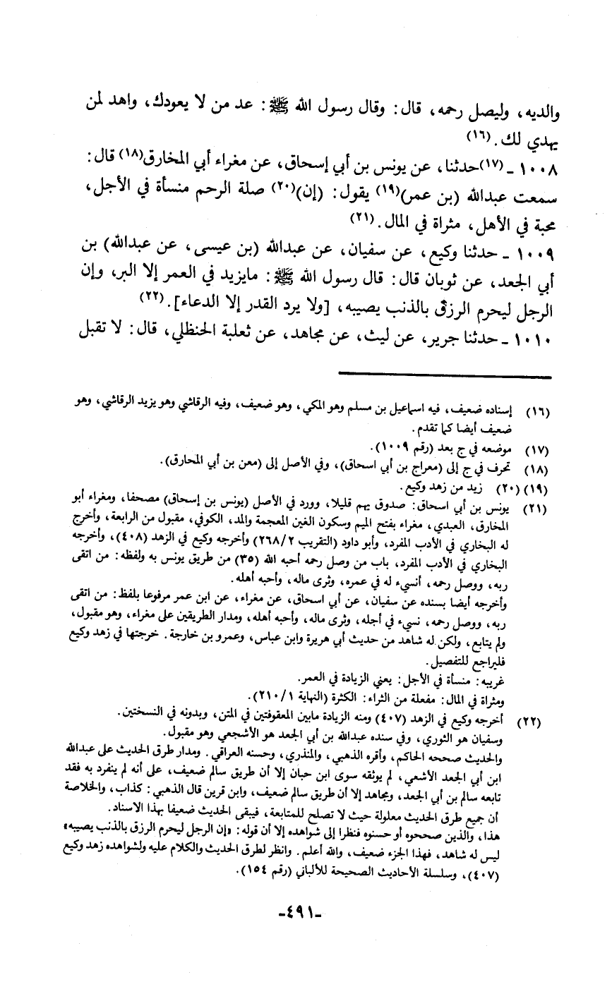 حَدَّثَنَا عَنْ يُونُسَ بْنِ أَبِي إِسْحَاقَ، عَنْ مَغْرَاءَ أَبِي الْمُخَارِقِ قَالَ: سَمِعْتُ عَبْدَ اللَّهِ بْنَ عُمَرَ يَقُولُ: «إِنَّ §صِلَةَ الرَّحِمِ مَنْسَأَةٌ فِي الْأَجَلِ، مَحَبَّةٌ فِي الْأَهْلِ، مَثْرَاةٌ فِي الْمَالِ»