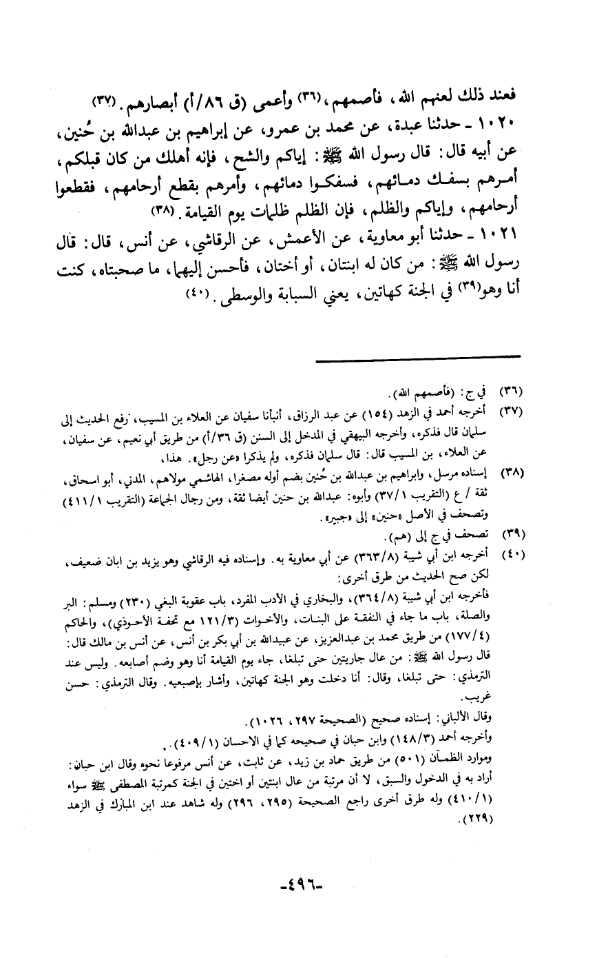 حَدَّثَنَا أَبُو مُعَاوِيَةَ، عَنِ الْأَعْمَشِ، عَنِ الرَّقَاشِيِّ، عَنْ أَنَسٍ قَالَ: قَالَ رَسُولُ اللَّهِ صَلَّى اللهُ عَلَيْهِ وَسَلَّمَ: «§مَنْ كَانَ لَهُ ابْنَتَانِ أَوْ أُخْتَانِ فَأَحْسَنَ إِلَيْهِمَا مَا صَحِبَتَاهُ كُنْتُ أَنَا وَهُوَ فِي الْجَنَّةِ كَهَاتَيْنِ» ، يَعْنِي السَّبَّابَةَ وَالْوُسْطَى