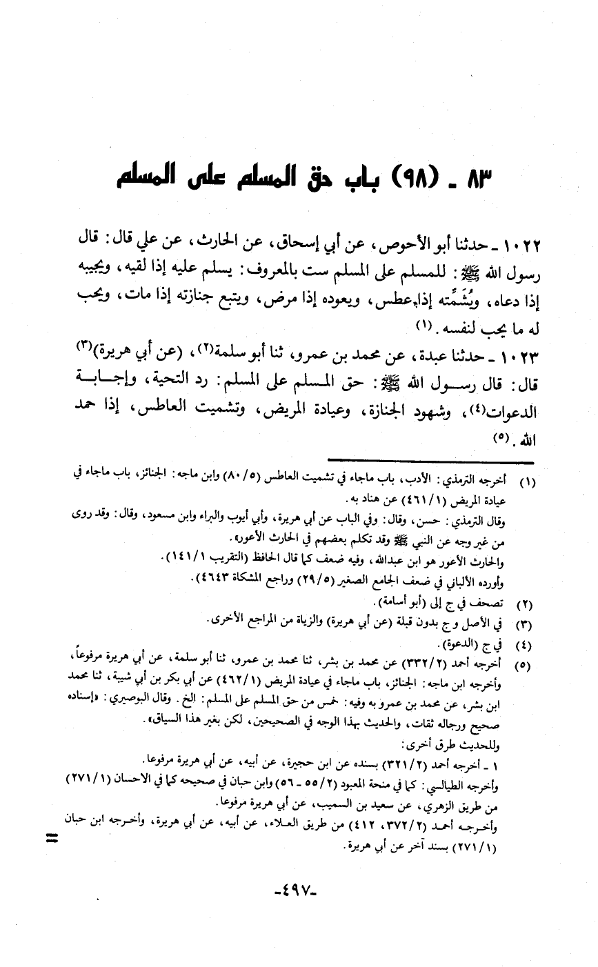 حَدَّثَنَا عَبْدَةُ، عَنْ مُحَمَّدِ بْنِ عَمْرٍو، ثنا أَبُو سَلَمَةَ، عَنْ أَبِي هُرَيْرَةَ قَالَ: قَالَ رَسُولُ اللَّهِ صَلَّى اللهُ عَلَيْهِ وَسَلَّمَ: «§حَقُّ الْمُسْلِمِ عَلَى الْمُسْلِمِ رَدُّ التَّحِيَّةِ , وَإِجَابَةُ الدَّعَوَاتِ , وَشُهُودُ الْجِنَازَةِ , وَعِيَادَةُ الْمَرِيضِ , وَتَشْمِيتُ الْعَاطِسِ إِذَا حَمِدَ اللَّهَ»
