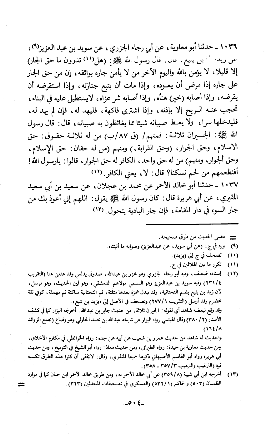 حَدَّثَنَا أَبُو مُعَاوِيَةَ، عَنْ رَجَاءٍ الْجَزَرِيِّ، عَنْ سُوَيْدِ بْنِ عَبْدِ الْعَزِيزِ، عَنْ زَيْدِ بْنِ يُثَيْعٍ قَالَ: قَالَ رَسُولُ اللَّهِ صَلَّى اللهُ عَلَيْهِ وَسَلَّمَ: " §هَلْ تَدْرُونَ مَا حَقُّ الْجَارِ إِلَّا قَلِيلًا لَا يُؤْمِنُ بِاللَّهِ وَالْيَوْمِ الْآخِرِ مَنْ لَا يَأْمَنُ جَارُهُ بَوَائِقَهُ، إِنَّ مِنْ حَقِّ الْجَارِ عَلَى جَارِهِ إِذَا مَرِضَ أَنْ يَعُودَهُ وَإِذَا مَاتَ أَنْ يَتْبَعَ جِنَازَتَهُ، وَإِذَا اسْتَقْرَضَهُ أَنْ يُقْرِضَهُ، وَإِذَا أَصَابَهُ خَيْرٌ هَنَّأَهُ، وَإِذَا أَصَابَهُ شَرٌّ عَزَّاهُ، لَا يَسْتَطِيلُ عَلَيْهِ فِي الْبِنَاءِ تَحْجُبُ عَنْهُ الرِّيحَ إِلَّا بِإِذْنِهِ، وَإِذَا اشْتَرَى فَاكِهَةً فَلْيُهْدِ لَهُ فَإِنْ لَمْ يُهْدِ لَهُ فَلْيُدْخِلْهَا سِرًّا وَلَا يُعْطِ صِبْيَانَهُ شَيْئًا مِمَّا يُغَائِظُونَ بِهِ صِبْيَانَهُ , قال: قَالَ رَسُولُ اللَّهِ صَلَّى اللهُ عَلَيْهِ وَسَلَّمَ: " الْجِيرَانُ ثَلَاثَةٌ: فَمِنْهُمْ مَنْ لَهُ ثَلَاثَةُ حُقُوقٍ حَقُّ الْإِسْلَامِ وَحَقُّ الْجِوَارِ وَحَقُّ الْقَرَابَةِ، وَمِنْهُمْ مَنْ لَهُ حَقَّانِ حَقُّ الْإِسْلَامِ وَحَقُّ الْجِوَارِ، وَمِنْهُمْ مَنْ لَهُ حَقٌّ وَاحِدٌ الْكَافِرُ لَهُ حَقُّ الْجِوَارِ ". قَالُوا يَا رَسُولَ اللَّهِ: أَفَنُطْعِمُهُمْ مِنْ لَحْمِ نُسُكِنَا؟ قَالَ: «لَا» , يَعْنِي الْكَافِرَ