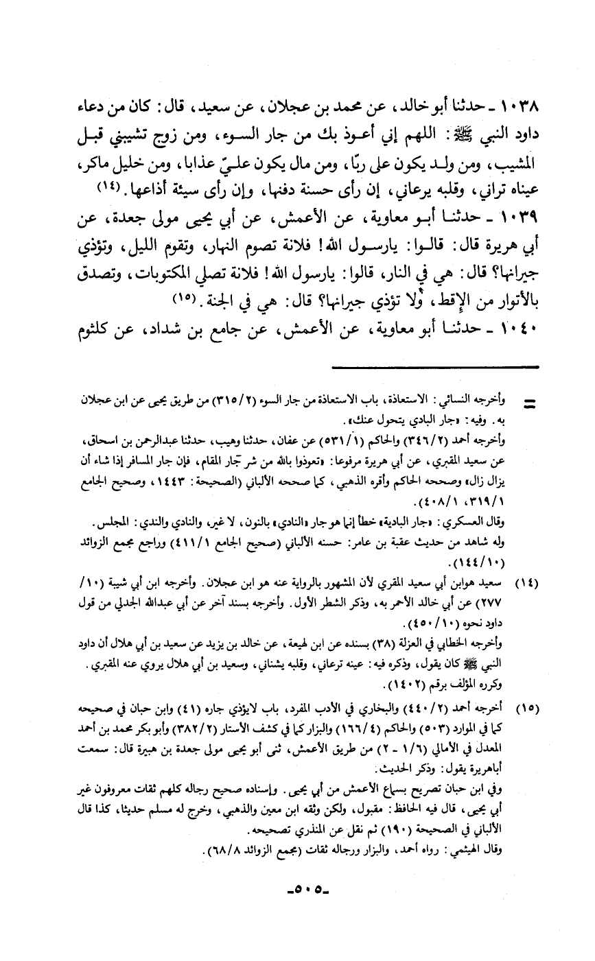حَدَّثَنَا أَبُو مُعَاوِيَةَ، عَنِ الْأَعْمَشِ، عَنْ جَامِعِ بْنِ شَدَّادٍ، عَنْ كُلْثُومٍ -[506]- الْخُزَاعِيِّ قَالَ: أَتَى النَّبِيَّ صَلَّى اللهُ عَلَيْهِ وَسَلَّمَ رَجُلٌ , فَقَالَ: يَا رَسُولَ اللَّهِ , كَيْفَ لِي إِذَا أَحْسَنْتُ أَنْ أَعْلَمَ أَنِّي قَدْ أَحْسَنْتُ؟ وَإِذَا أَسَأْتُ كَيْفَ لِي أَنْ أَعْلَمَ أَنِّي قَدْ أَسَأْتُ؟ قَالَ: فَقَالَ رَسُولُ اللَّهِ صَلَّى اللهُ عَلَيْهِ وَسَلَّمَ: " §إِذَا قَالَ لَكَ جِيرَانُكَ: إِنَّكَ قَدْ أَحْسَنْتَ فَقَدْ أَحْسَنْتَ، وَإِذَا قَالَ لَكَ جِيرَانُكَ: قَدْ أَسَأْتَ فَقَدْ أَسَأْتَ "