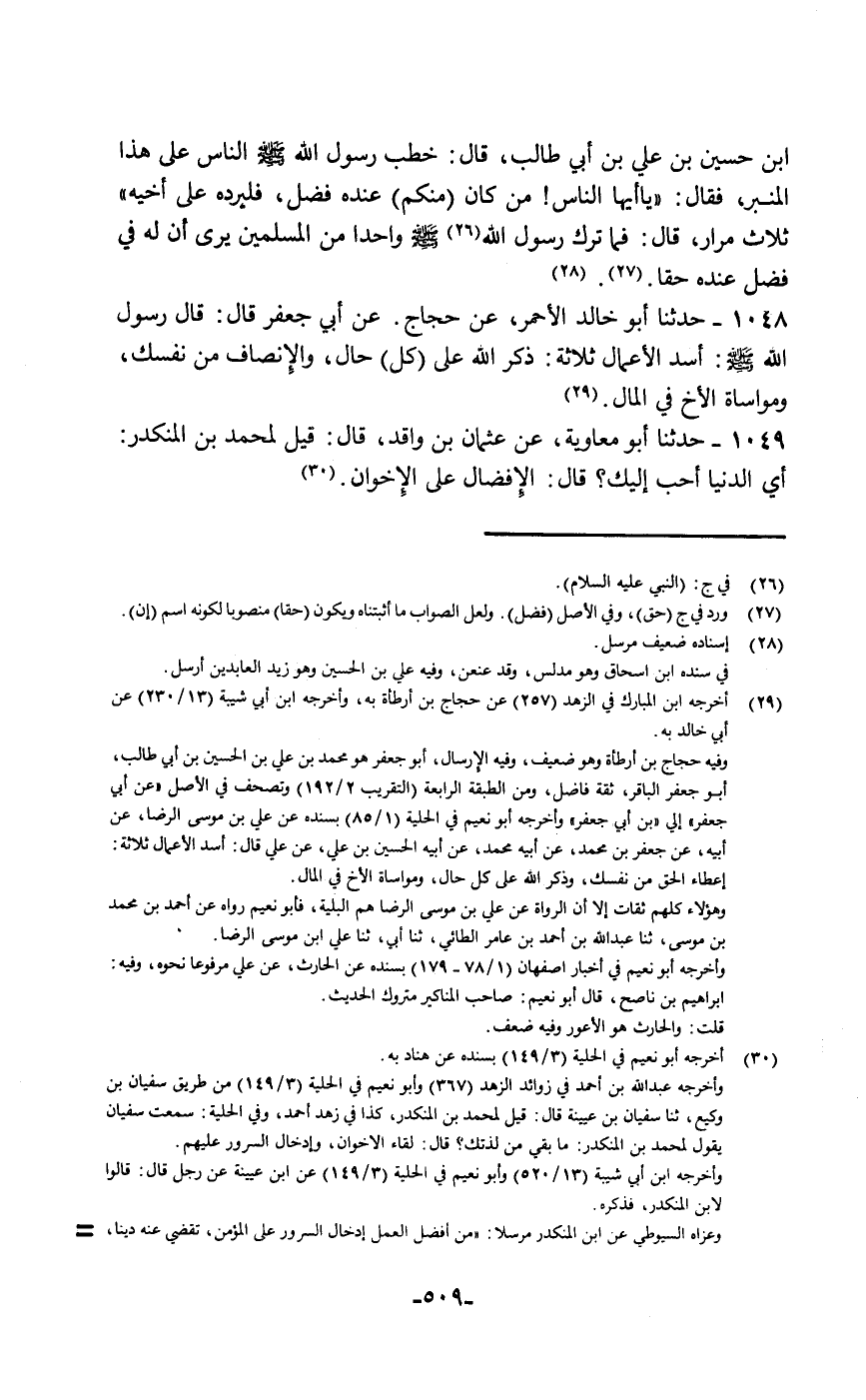 حَدَّثَنَا أَبُو خَالِدٍ الْأَحْمَرُ، عَنْ حَجَّاجٍ، عَنْ أَبِي جَعْفَرٍ قَالَ: قَالَ رَسُولُ اللَّهِ صَلَّى اللهُ عَلَيْهِ وَسَلَّمَ: " أَسَدُ الْأَعْمَالِ ثَلَاثَةٌ: ذِكْرُ اللَّهِ عَلَى كُلِّ حَالٍ، وَالْإِنْصَافُ مِنْ نَفْسِكِ، §وَمُوَاسَاةُ الْأَخِ فِي الْمَالِ "